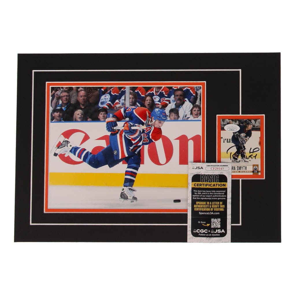 Custom display measures approximately 12" x 17" in size and features a sports card that has been hand-signed by Ryan Smyth (Edmonton Oilers). The display also features an 8" x 10" photo.