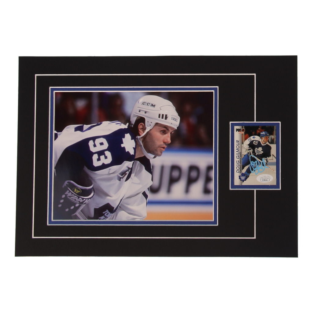 Custom display measures approximately 12" x 17" in size and features a sports card that has been hand-signed by Doug Gilmour (Toronto Maple Leafs). The display also features an 8" x 10" photo.