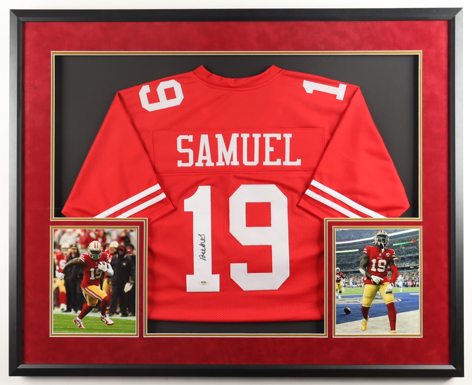Custom frame measures approximately 34" x 42" in size and features a jersey that has been hand-signed by Deebo Samuel.