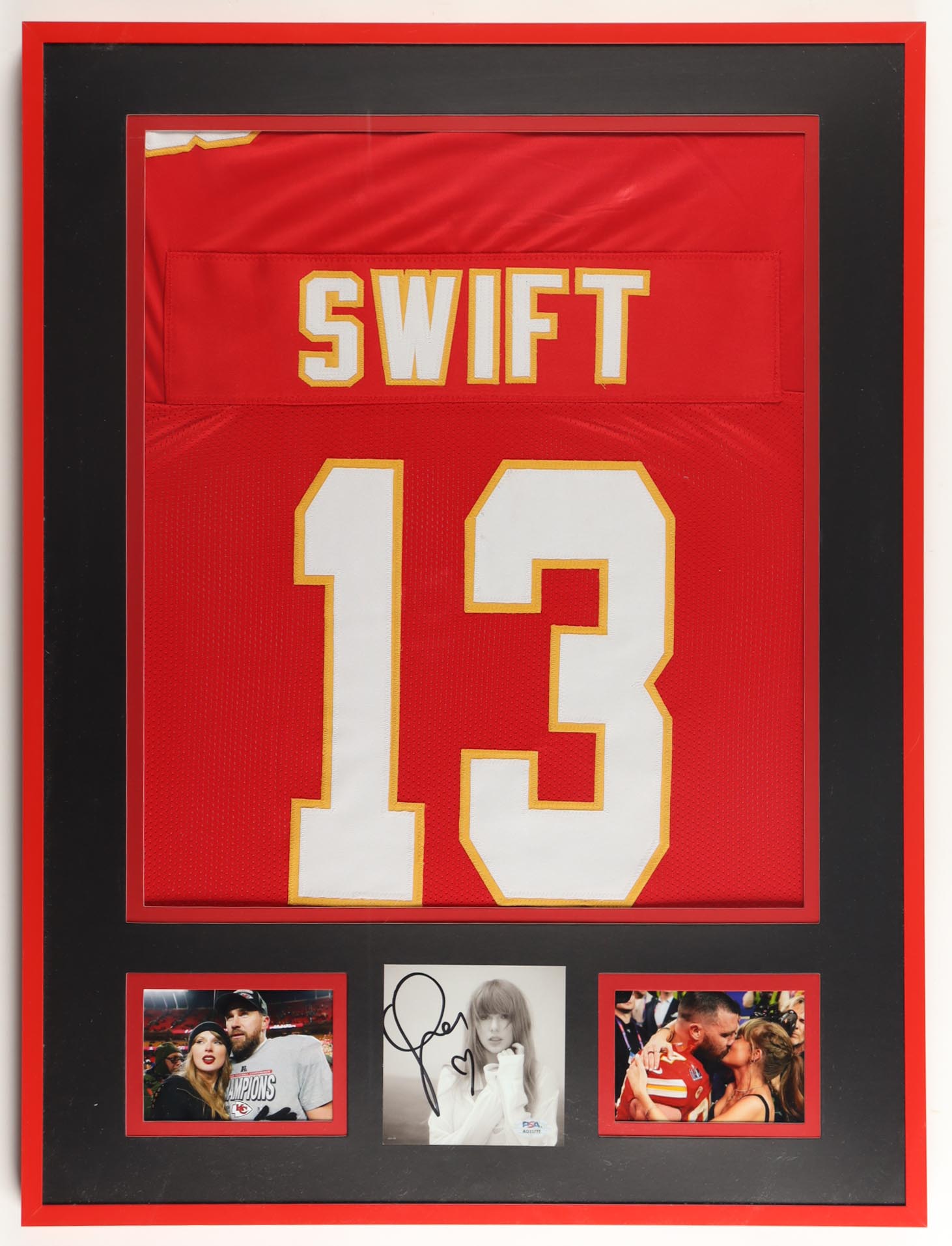 Custom frame measures approximately 23.5" x 31.5" in size. Features a "The Torture Poets Department" CD insert that has been hand-signed by Taylor Swift. Frame includes an unsigned jersey.