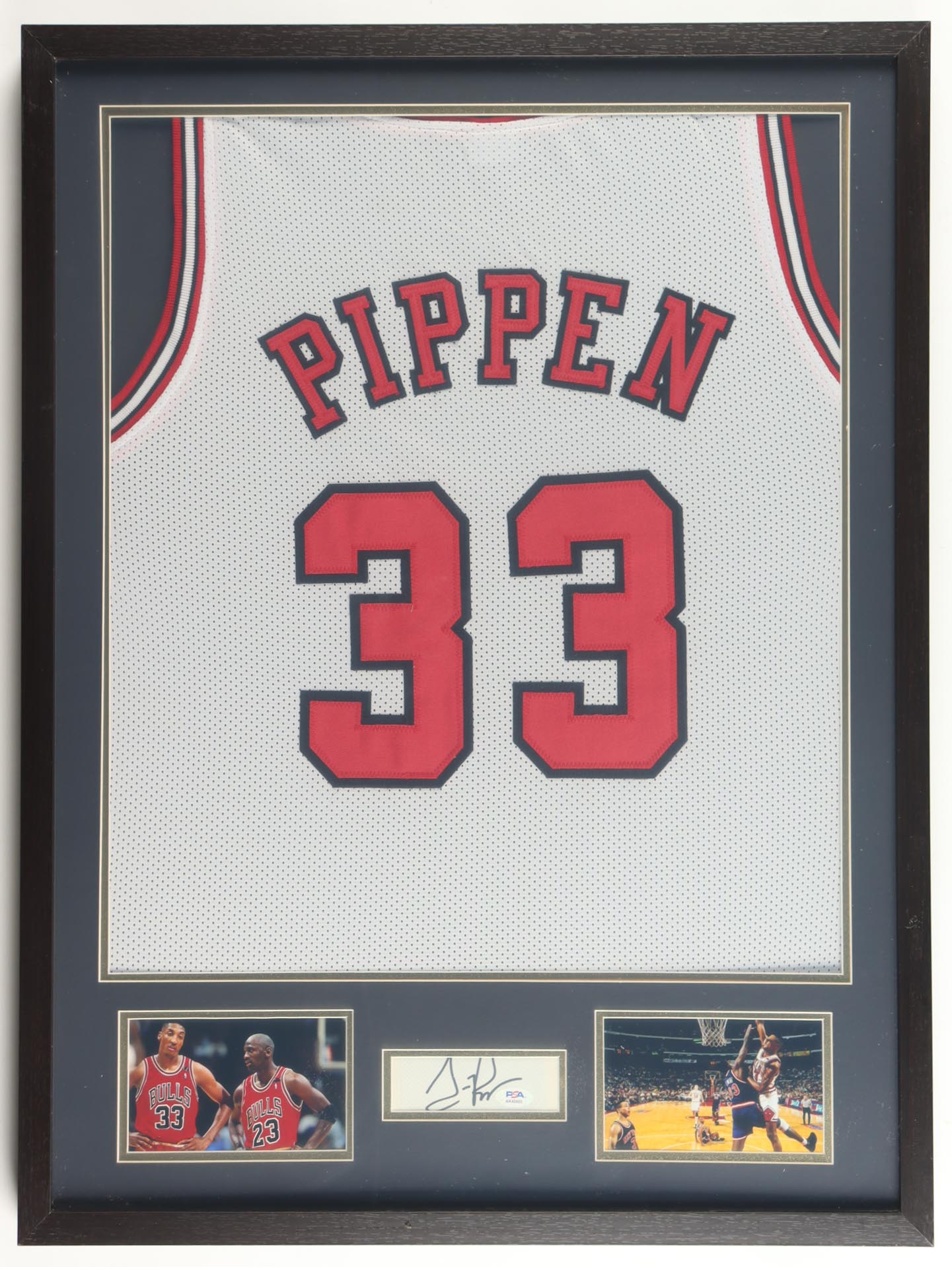 Custom frame measures approximately 23" x 31" in size and features a cut that has been hand-signed by Scottie Pippen (HOF). The display also includes an unsigned jersey.