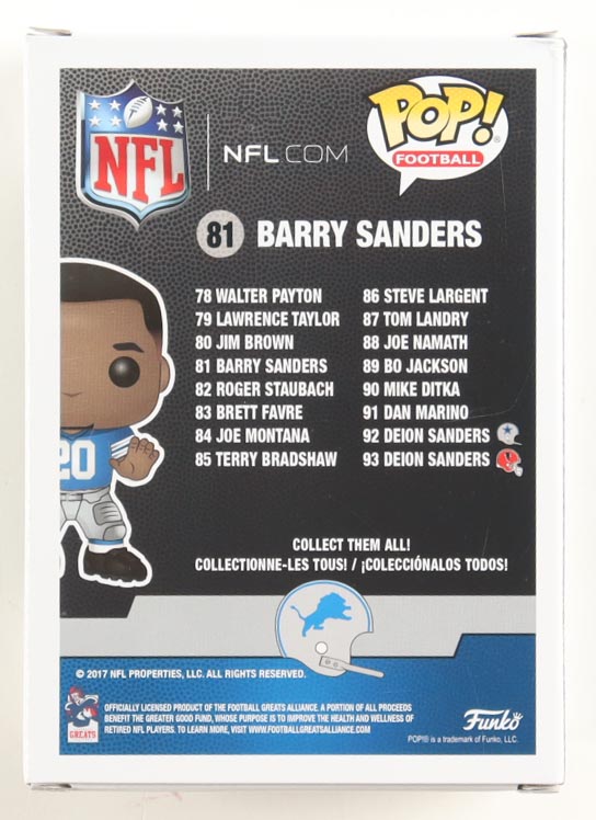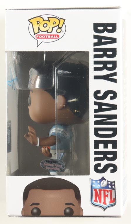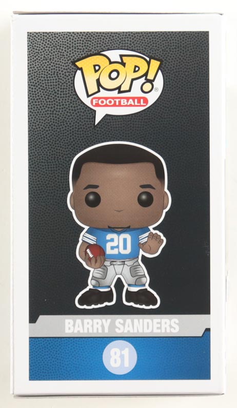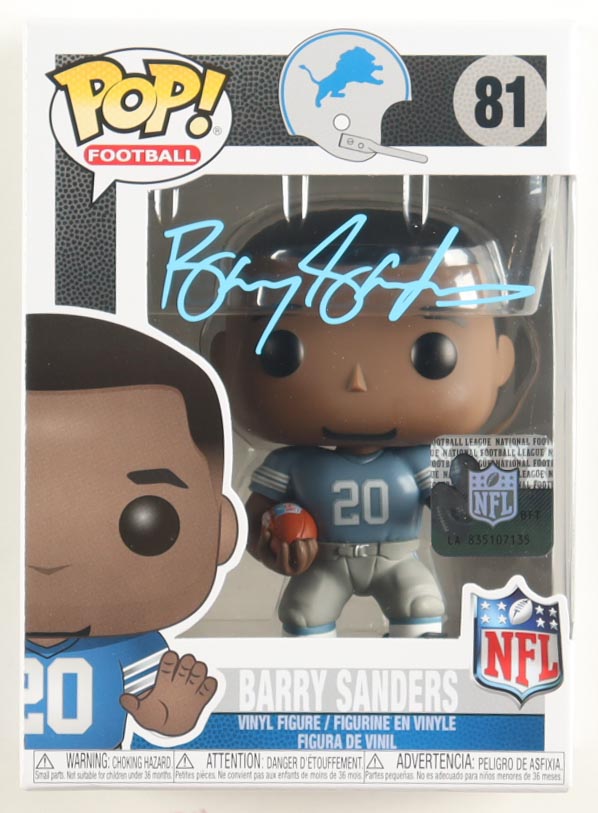 Funko Pop! vinyl figure measures 4" in height. Hand-signed on the packaging by Barry Sanders (Detroit Lions, HOF).