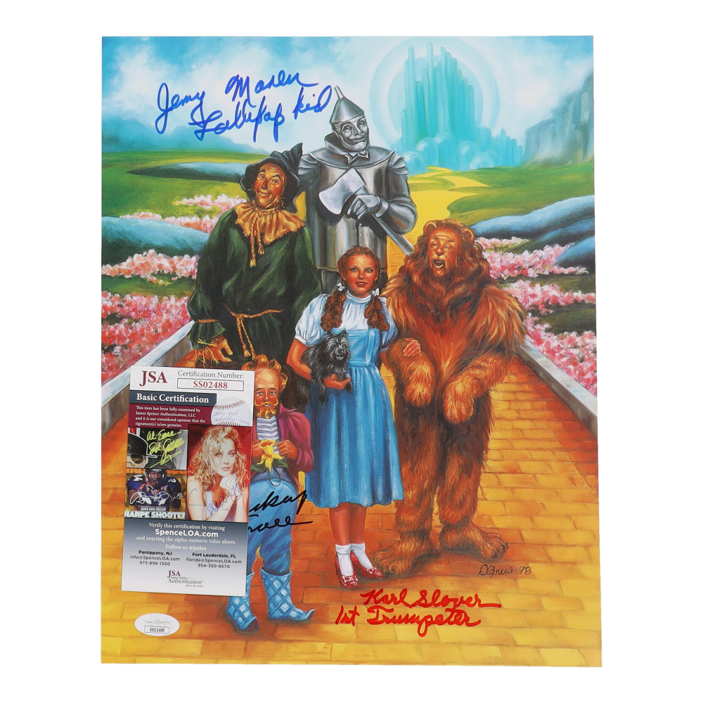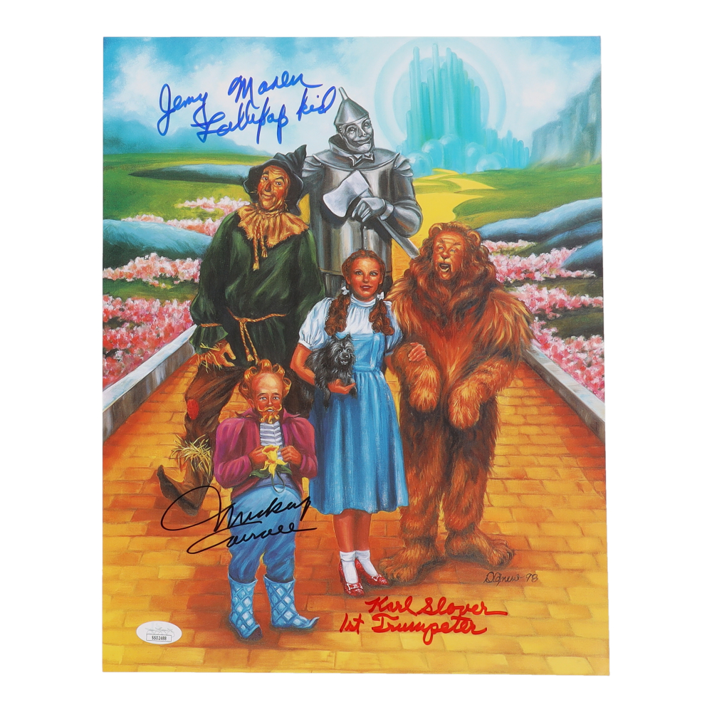 Mickey Carroll, Jerry Maren & Karl Slover Signed "The Wizard of Oz" 11x14 Photo Inscribed "Lollipop Kid" & "1st Trumpeter" (JSA)