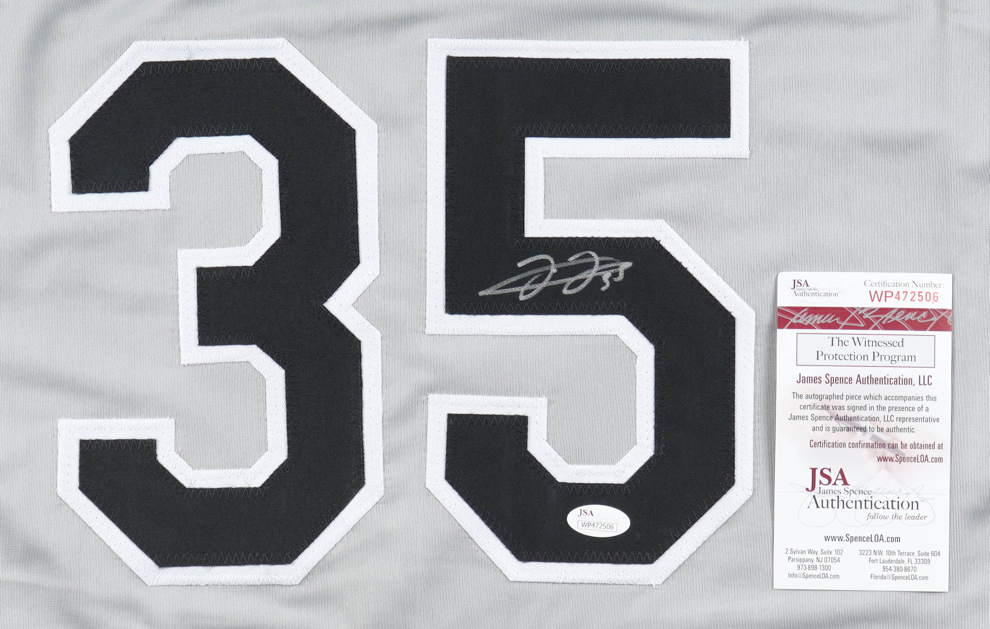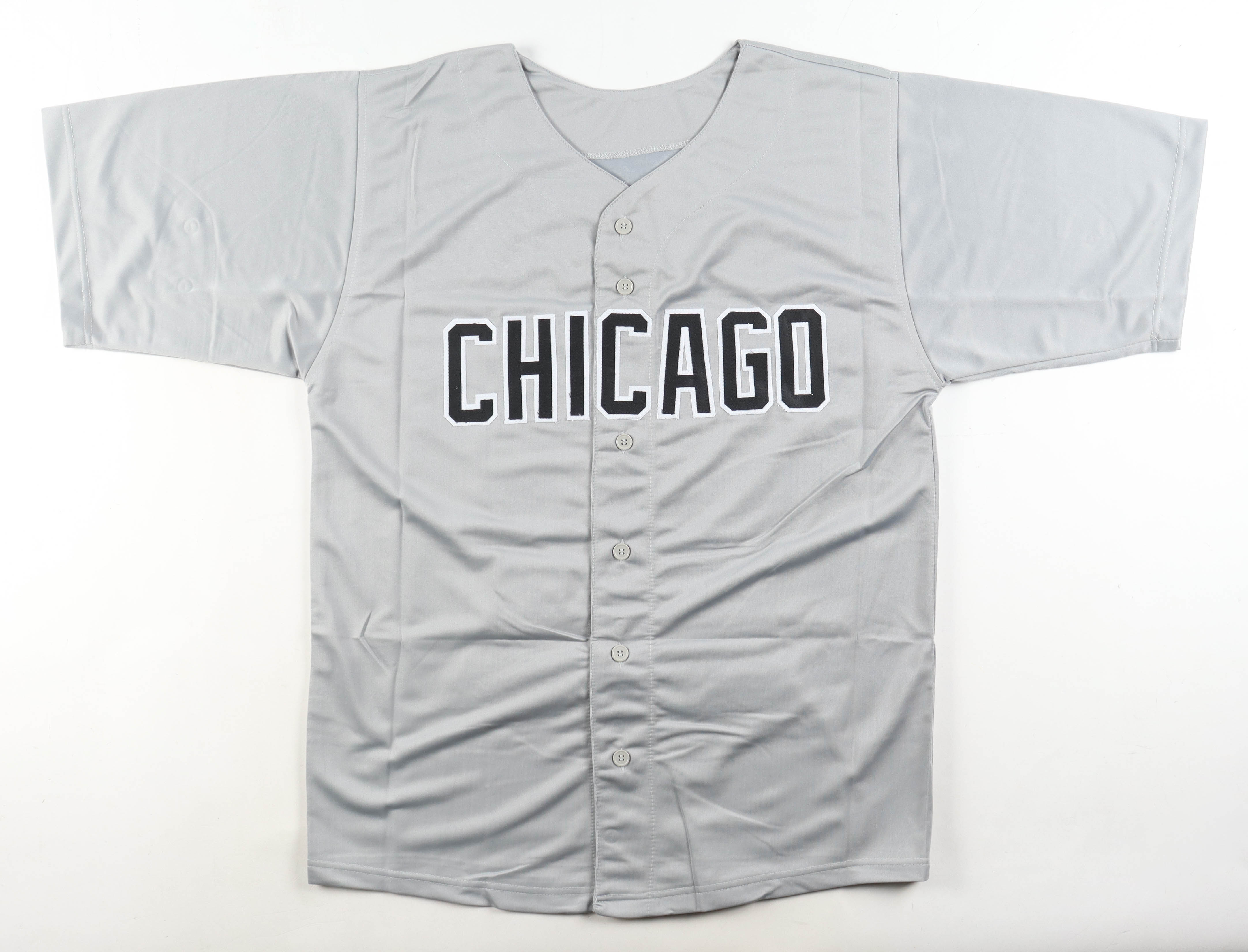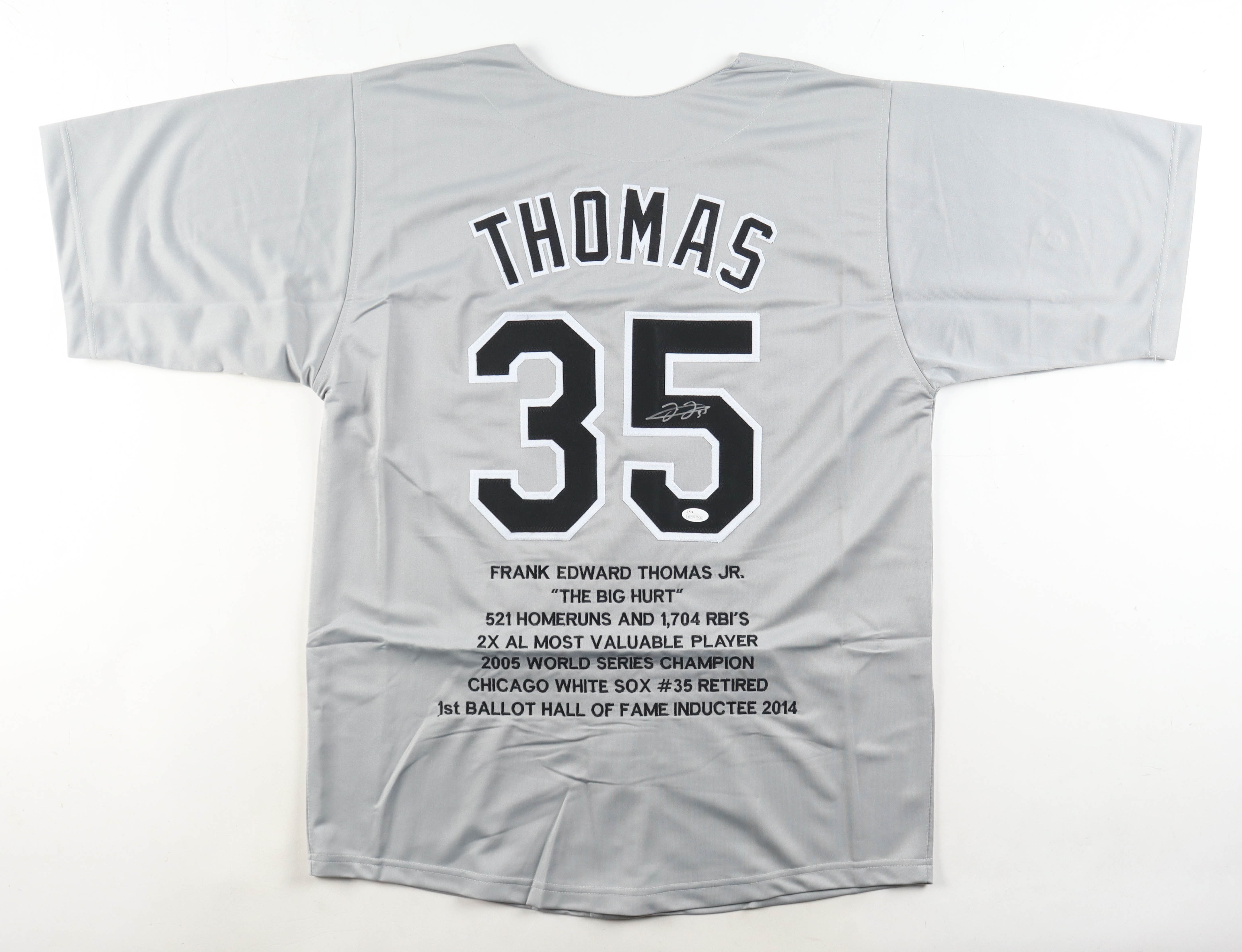 Custom jersey. Everything sewn on, size XL. Hand-signed by Frank Thomas (HOF). Frank Thomas's career stats have been stitched onto the reverse side of the jersey.