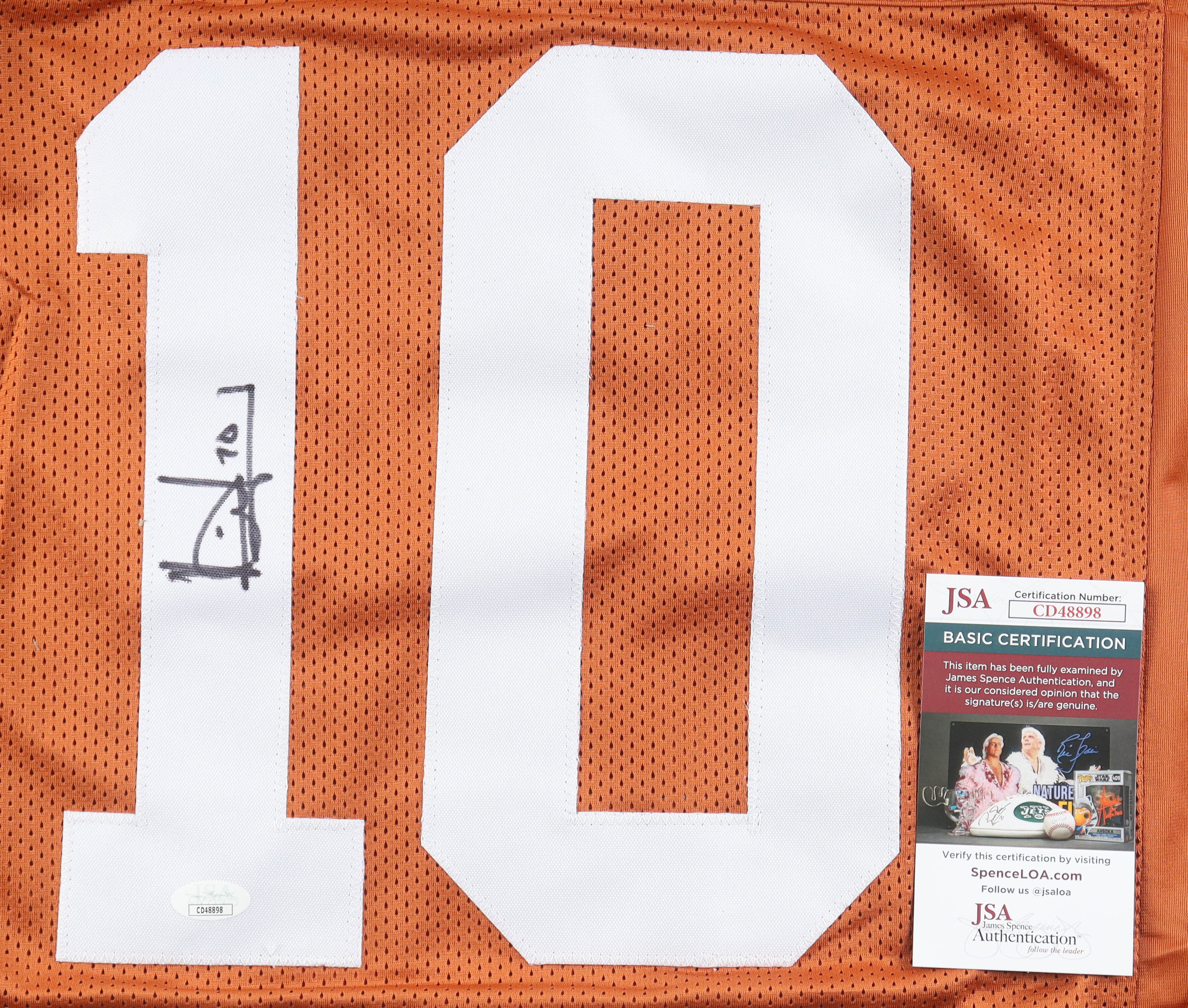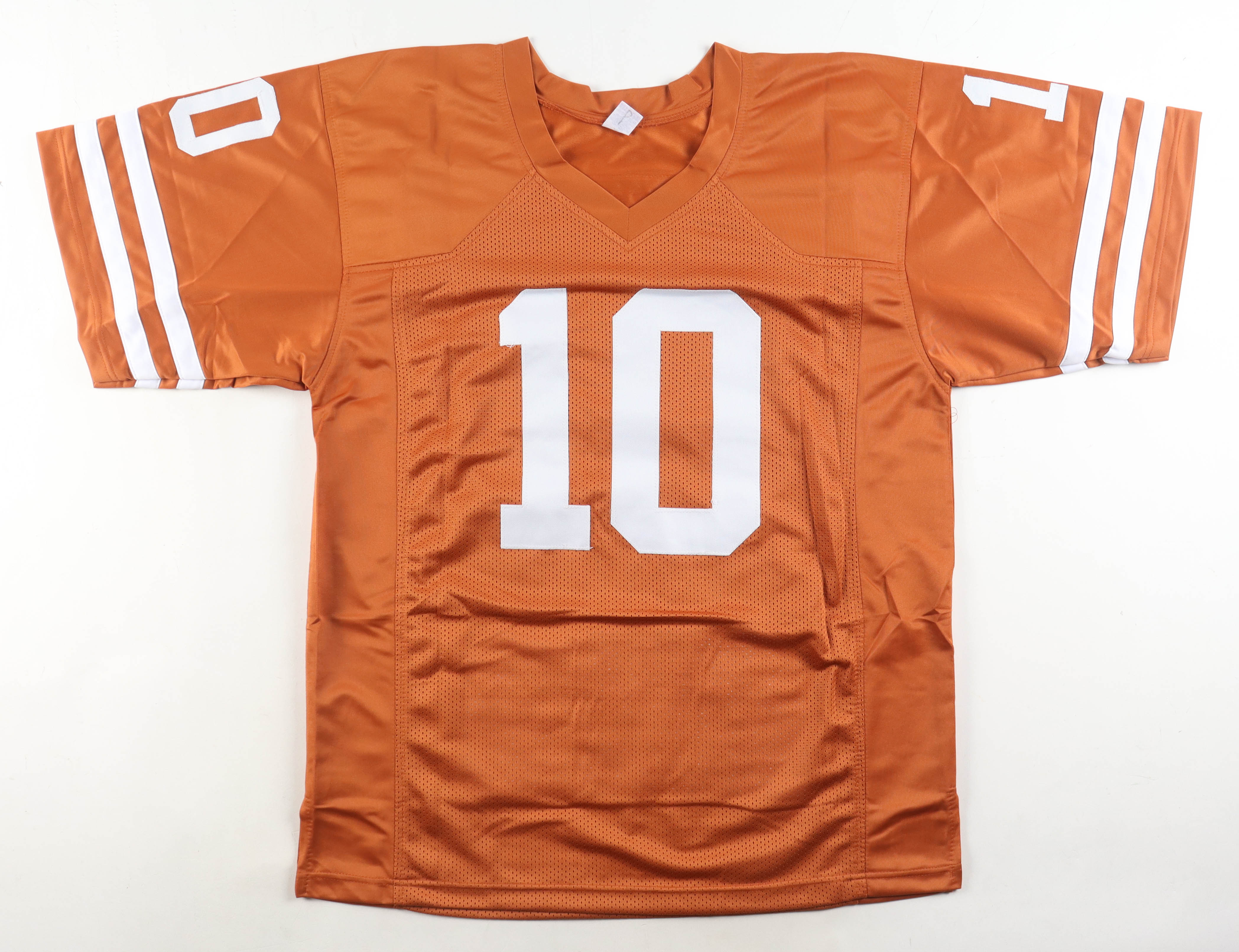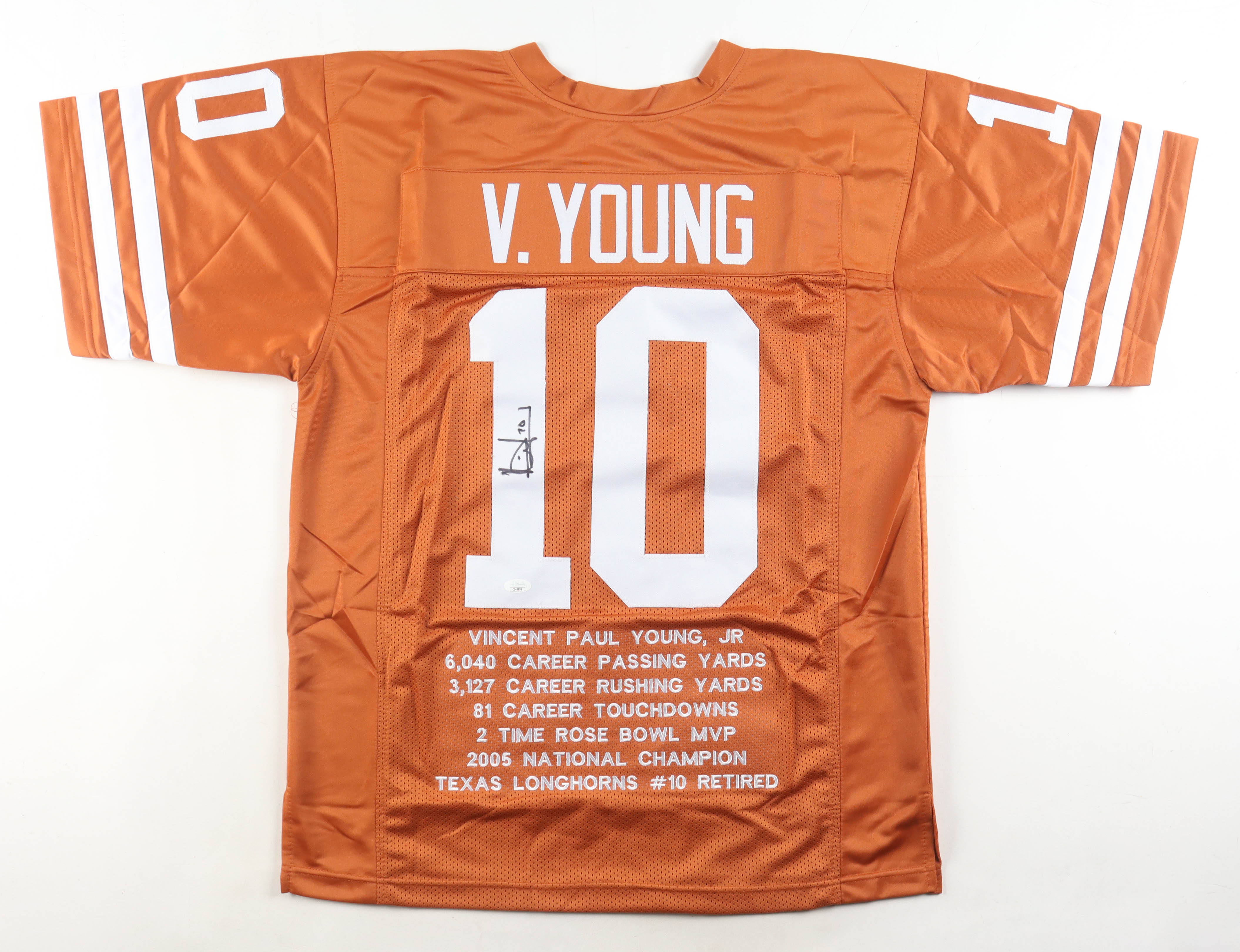 Custom jersey with everything sewn on, size XL. Hand-signed by Vince Young. Young's career highlights have been custom stitched onto the back of the jersey below the reverse numbers.