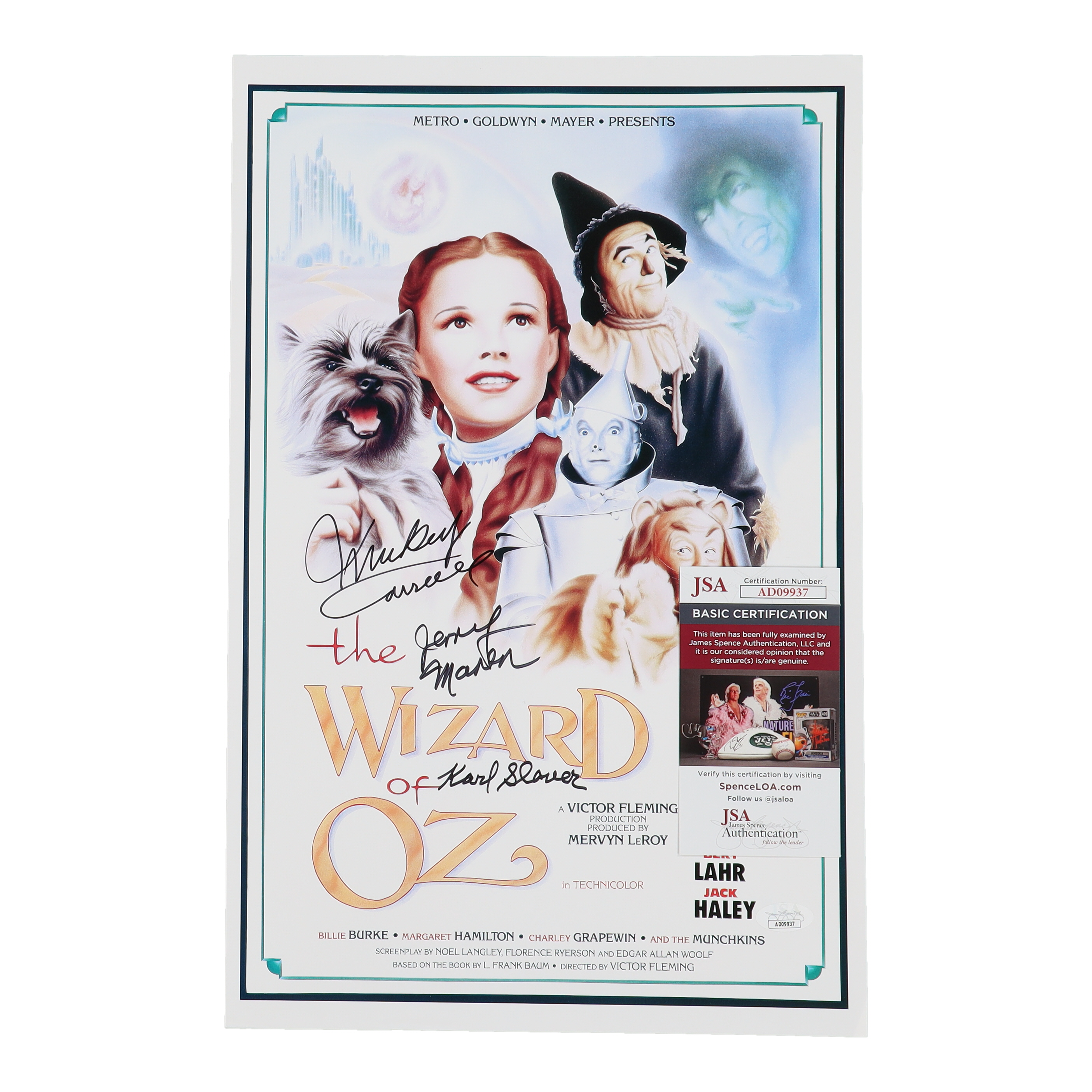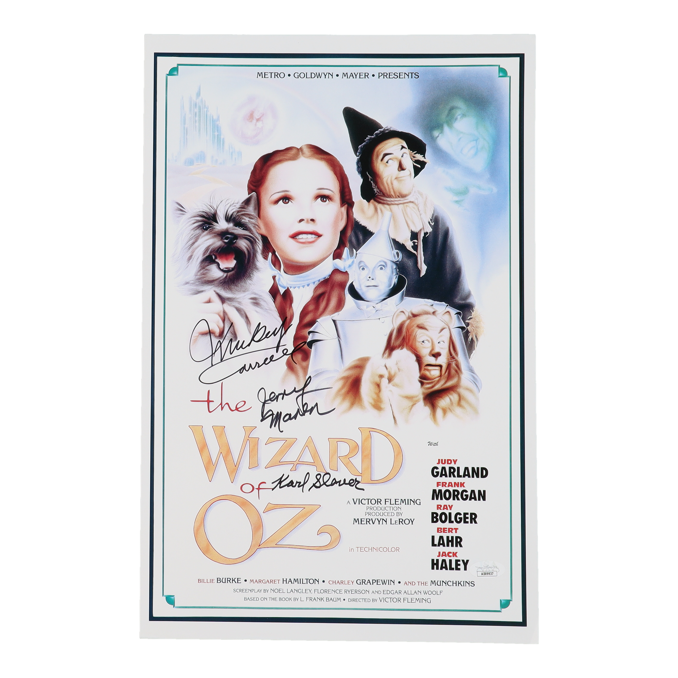 Photo measures approximately 11" x 17" in size and has been hand-signed by Mickey Carroll (D. 2009), Karl Slover (D. 2011) and Jerry Maren (D. 2018).