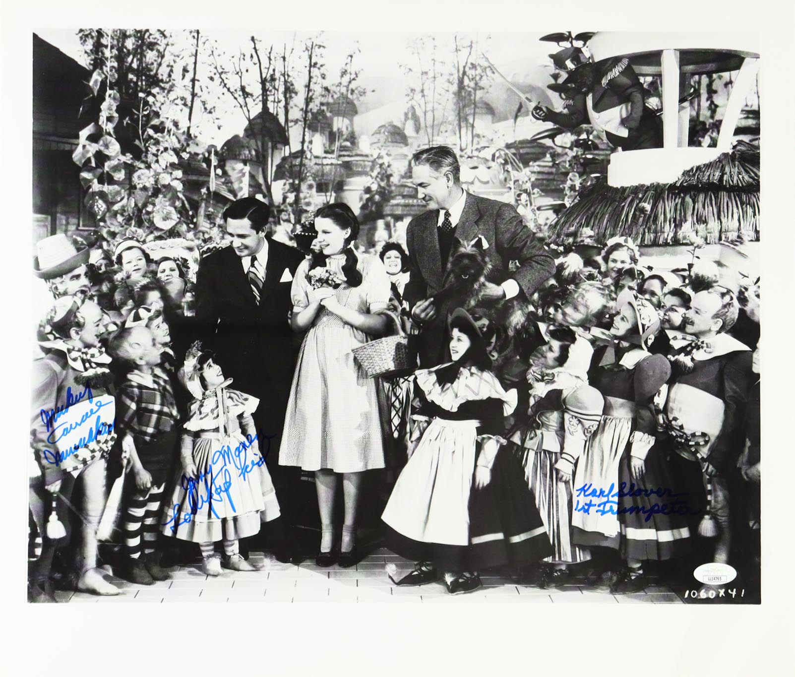 Mickey Carroll, Karl Slover & Jerry Maren Signed "The Wizard of Oz" 16x20 Photo Inscribed "Munchkin", "Lollipop Kid" & "1st Trumpeter" (JSA)