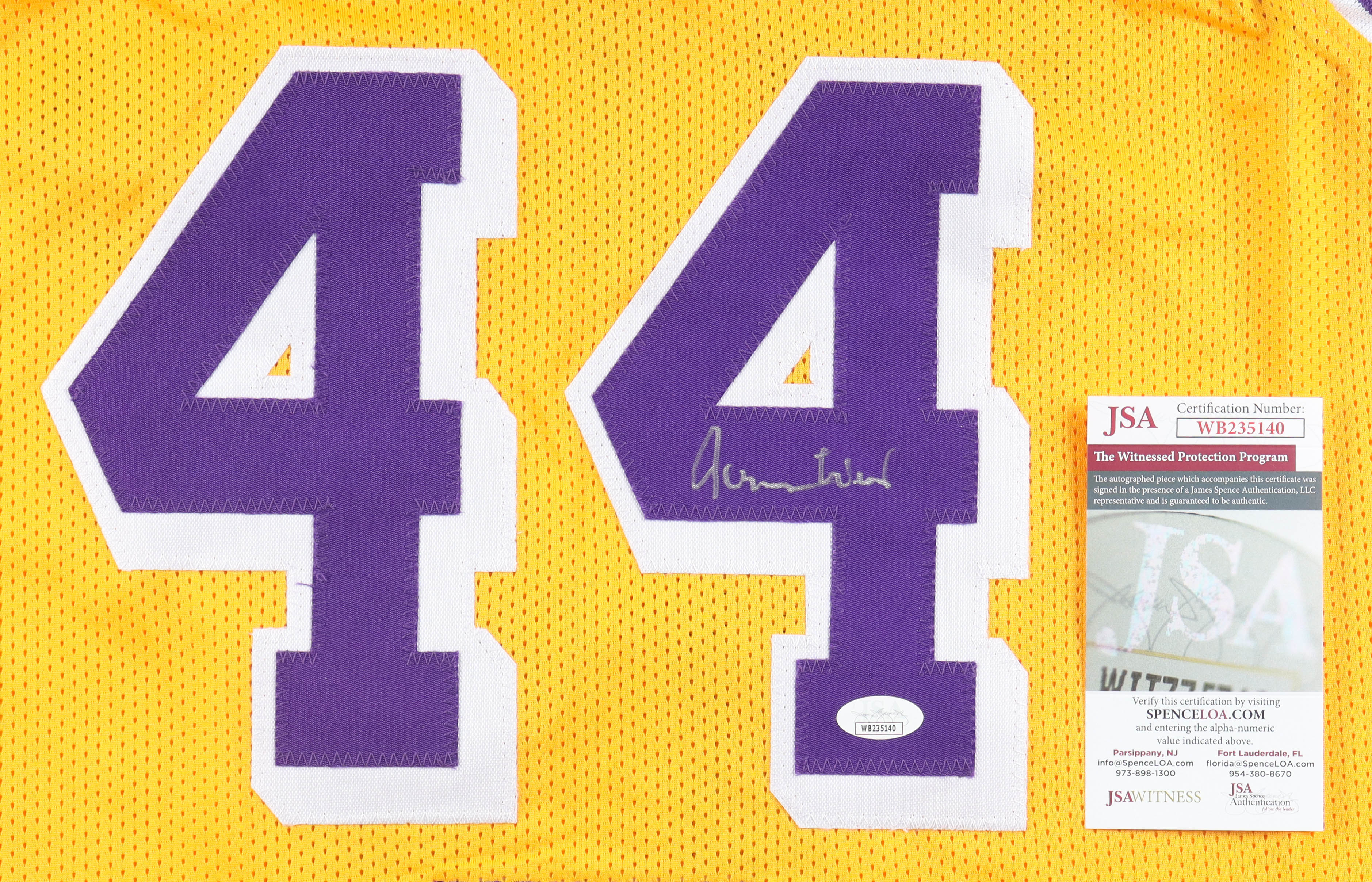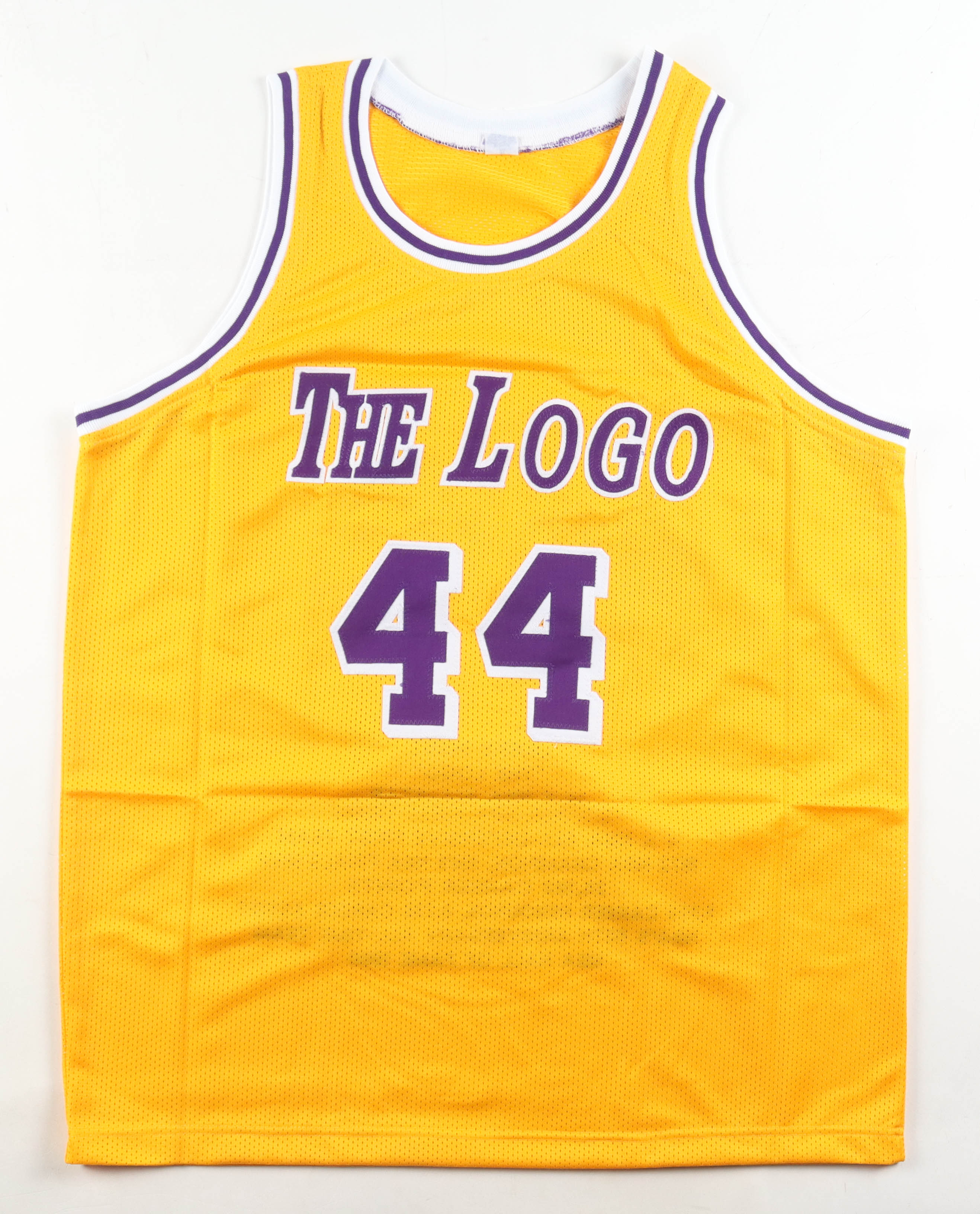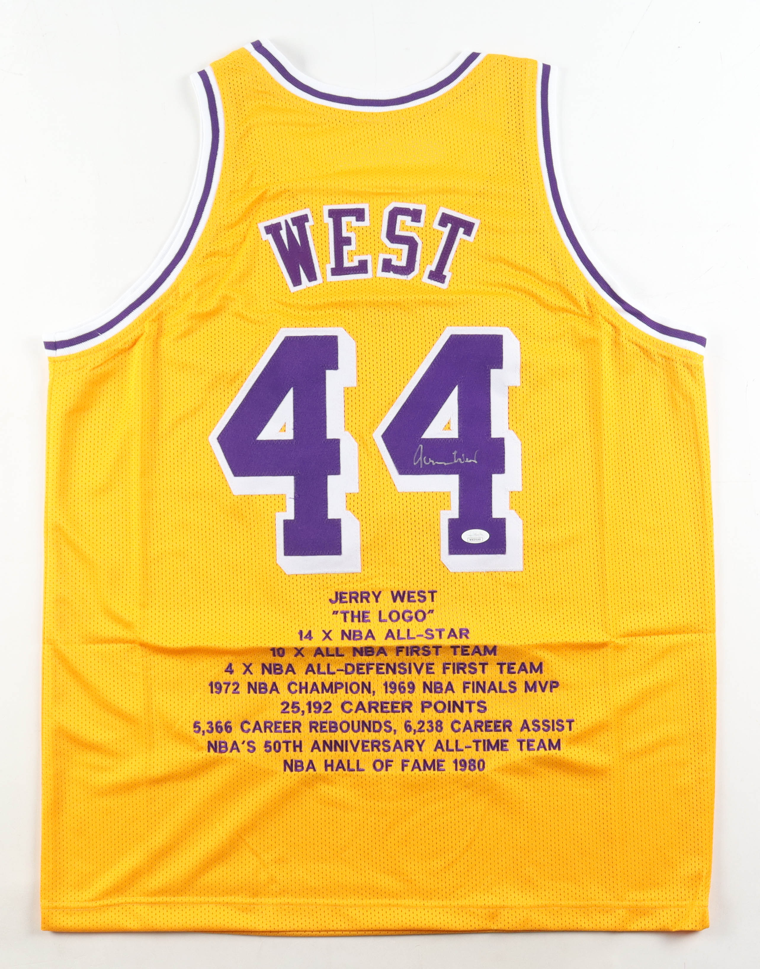 Custom jersey with everything sewn on, size XL. Hand-signed by Jerry West (D. 2024, Los Angeles Lakers, HOF). West's career highlights are custom stitched below the numbers on the reverse side of the jersey.