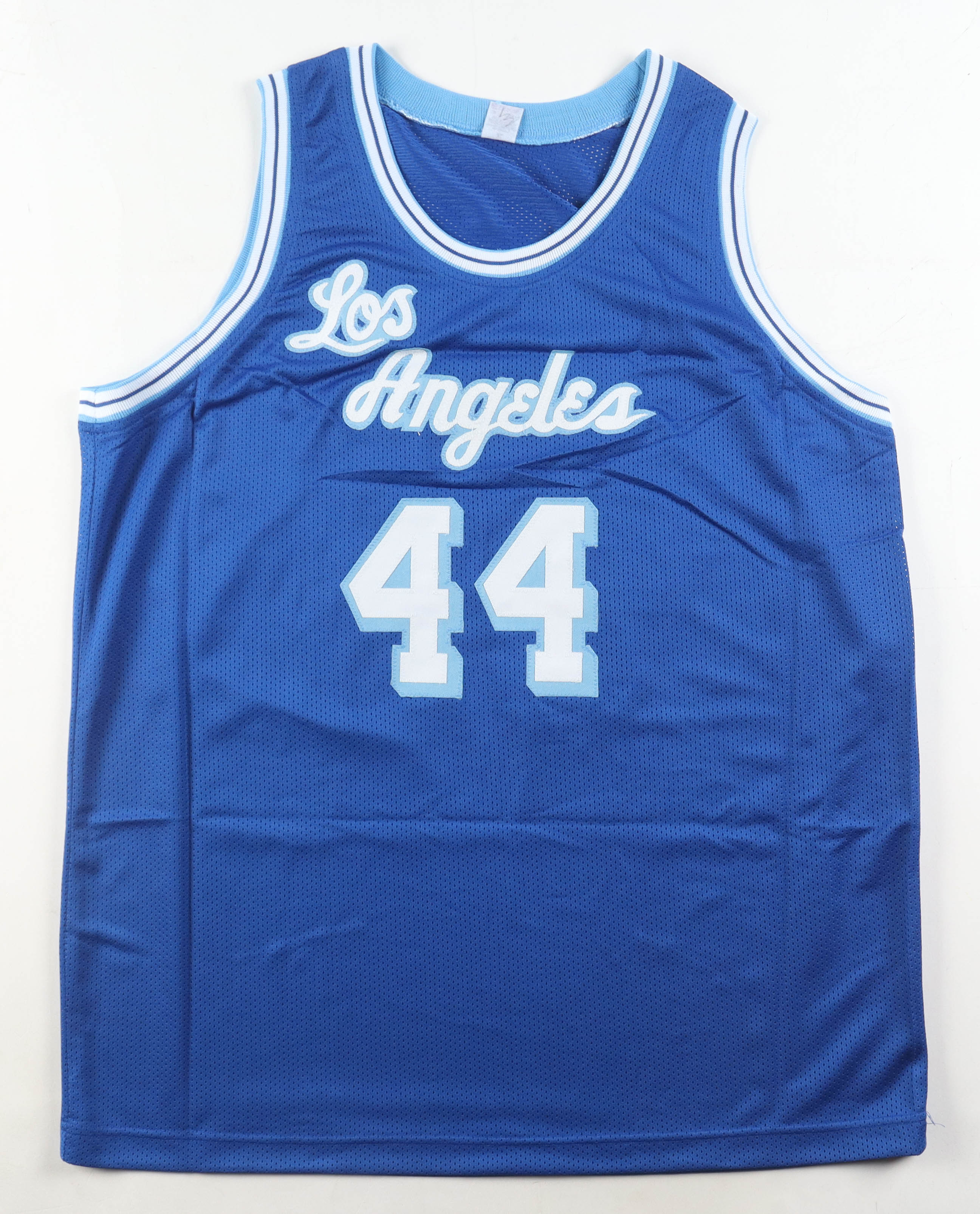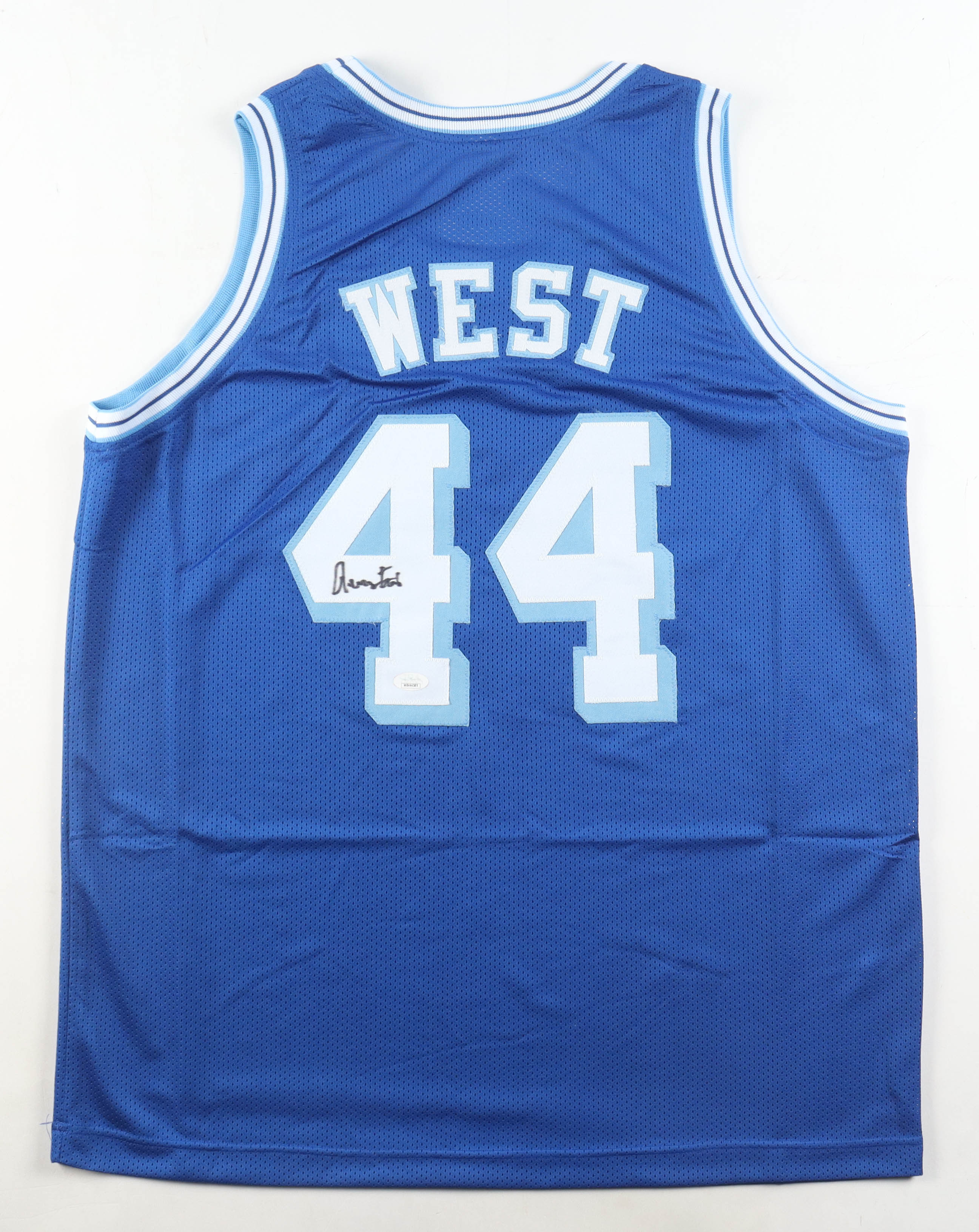Custom jersey with everything sewn on, size XL. Hand-signed by Jerry West (D. 2024, HOF).