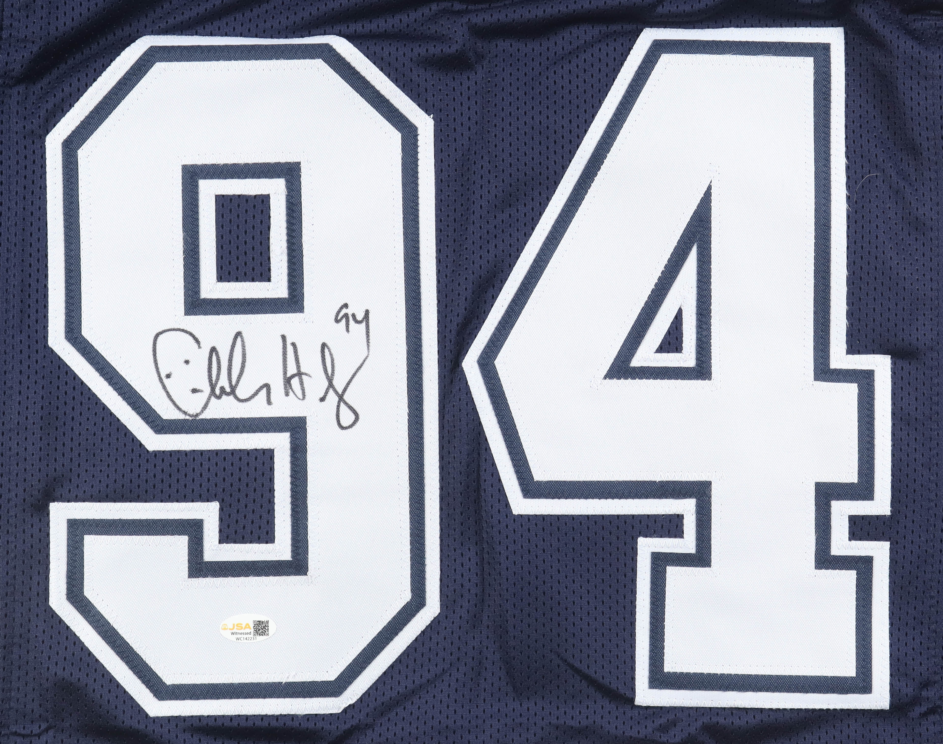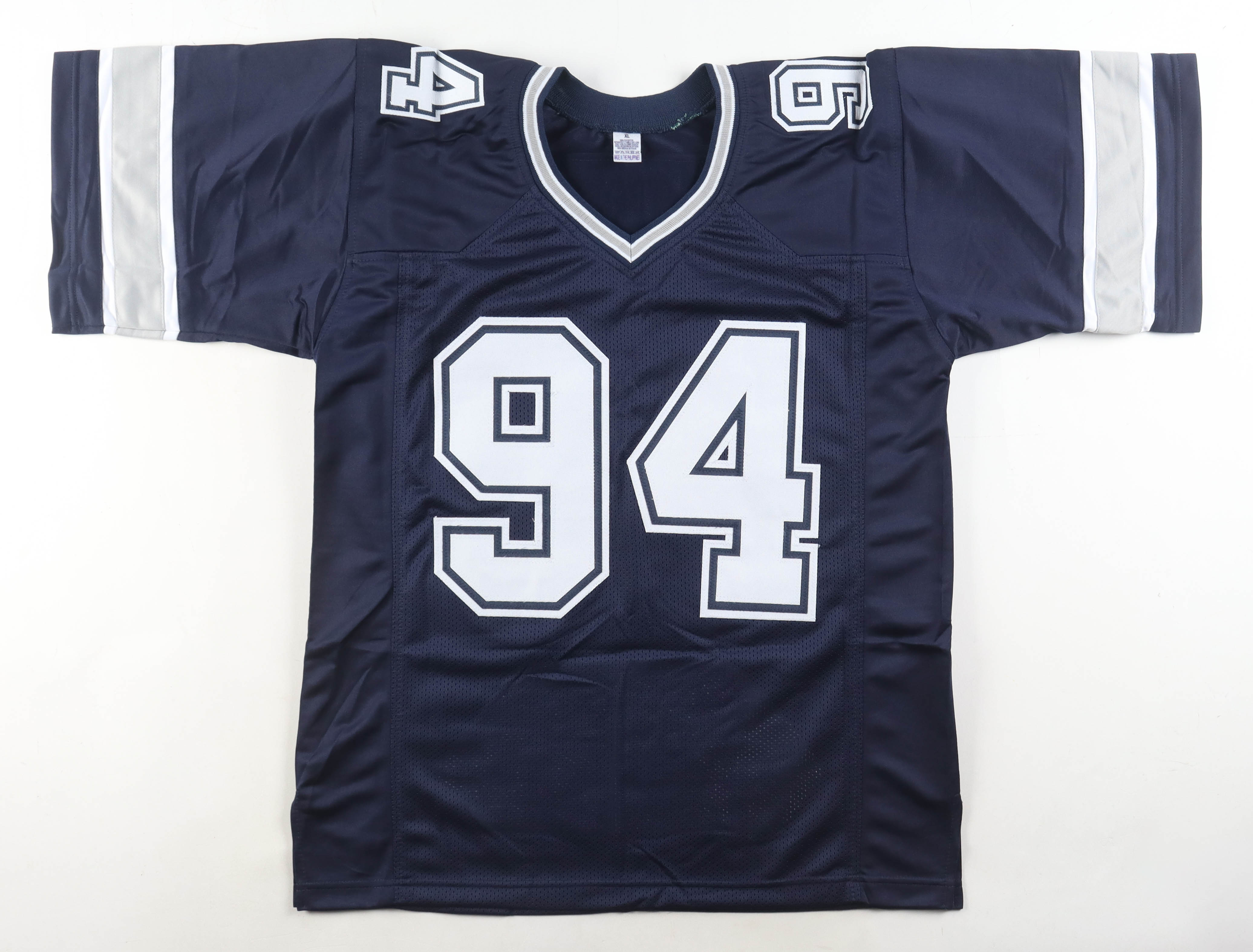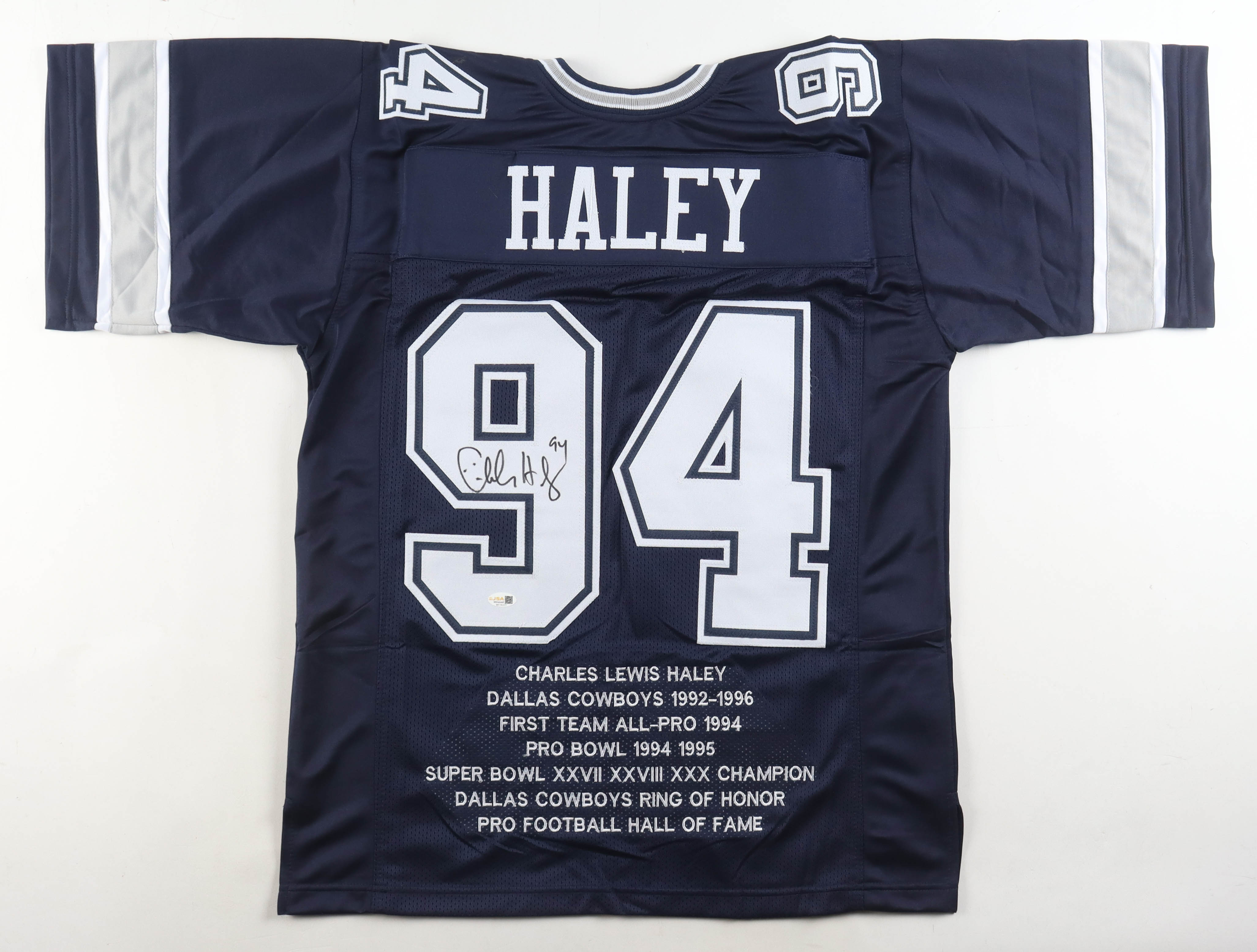 Custom jersey with everything sewn on, size XL. Hand-signed by Charles Haley (Dallas Cowboys, HOF). Haley's career highlight statistics have been hand-stitched below the reverse numbers.