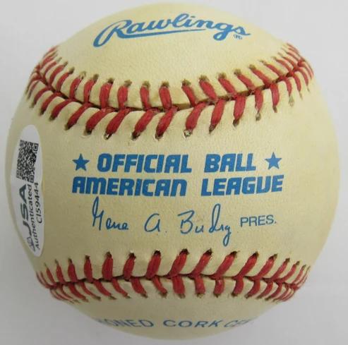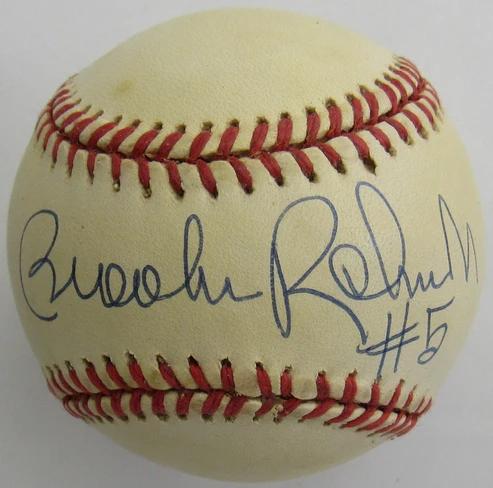 Rawlings Official American League baseball. Hand-signed by Brooks Robinson (D. 2023, Baltimore Orioles, HOF). Please note, the baseball is stained and naturally toned.
