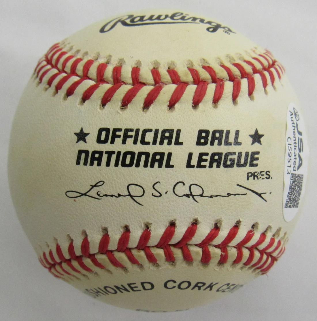 Rawlings Official National League Baseball. Hand-signed by Robin Roberts (D. 2010, Philadelphia Phillies, HOF). Please note, the baseball is naturally toned and stained.