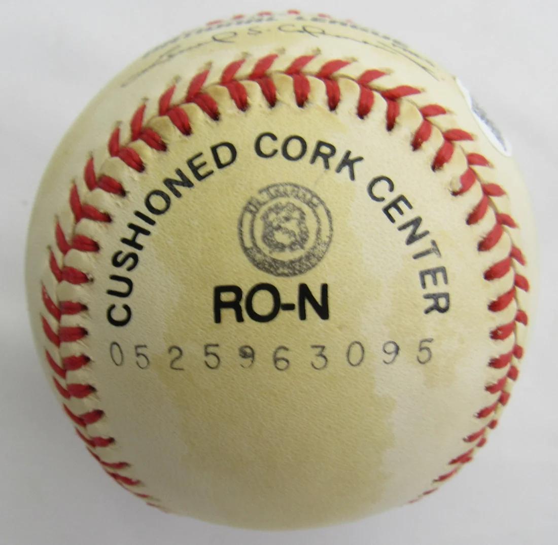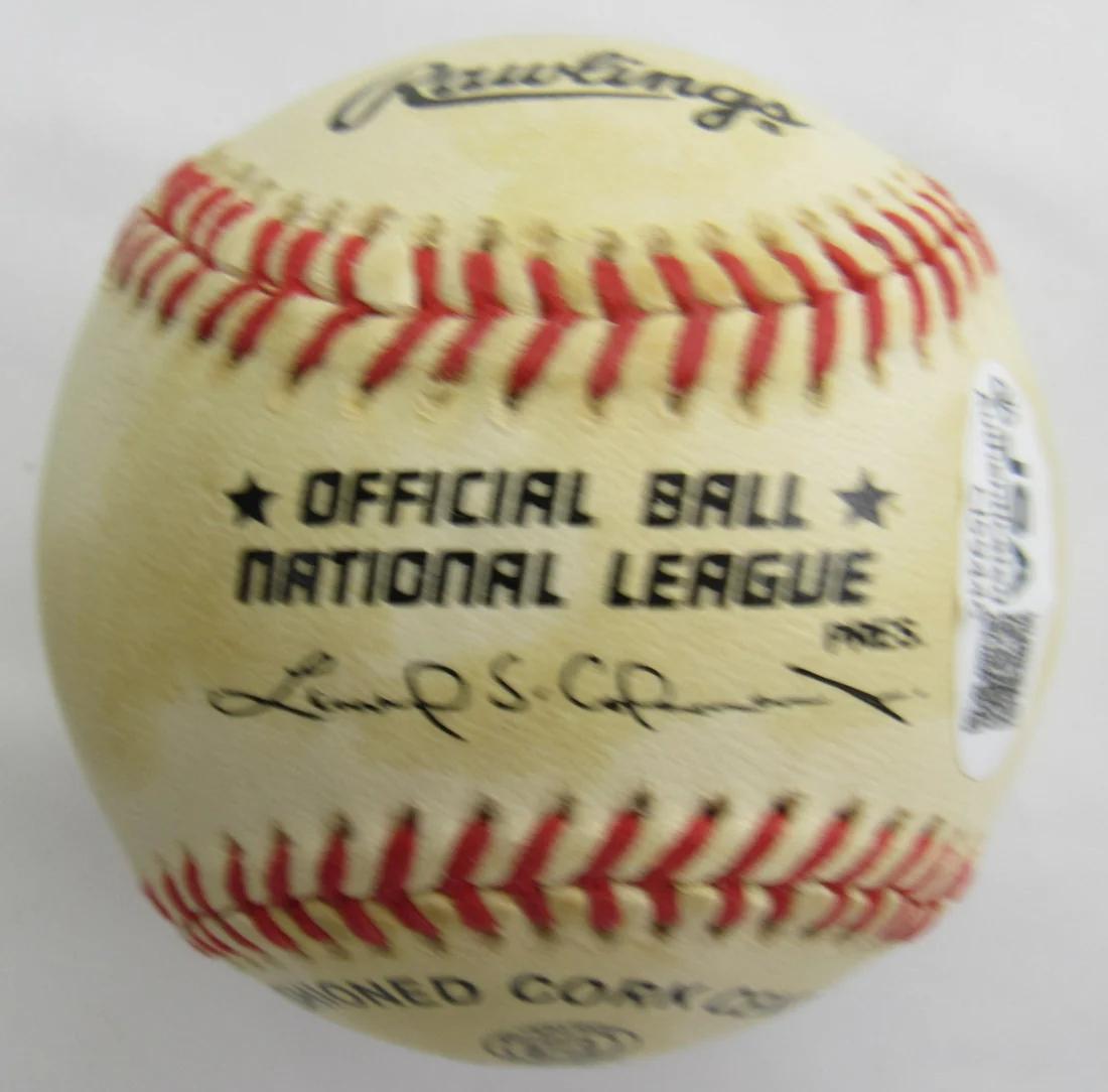 Rawlings Official National League Baseball. Hand-signed by Warren Spahn (D.2003, Milwaukee Braves, HOF). Please note, ball has been stained and naturally toned.
