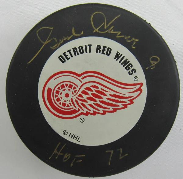 Detroit Red Wings logo hockey puck has been hand-signed by Gordie Howe (D. 2016, HOF).