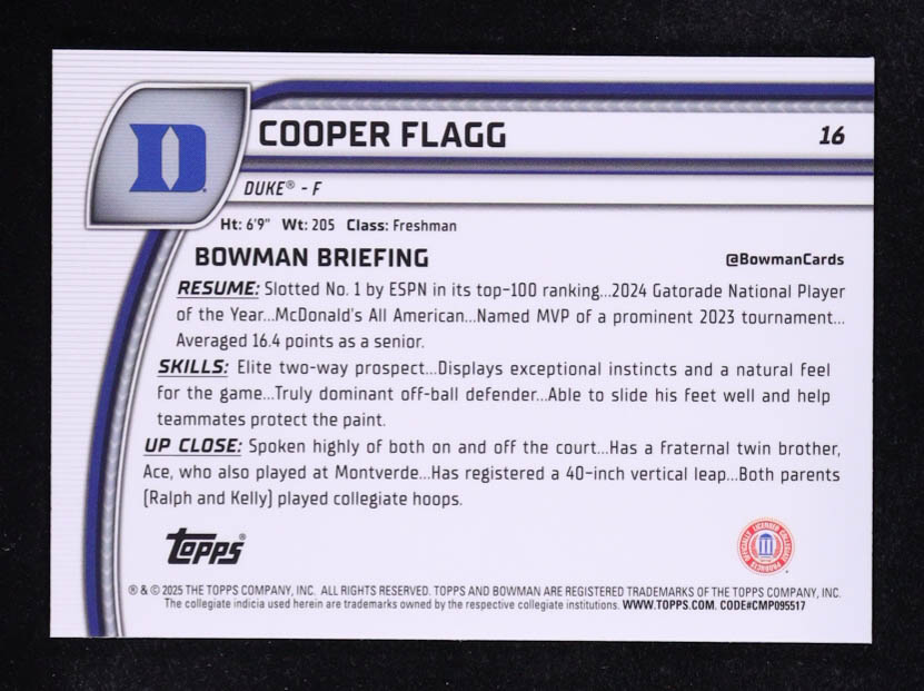 Cooper Flagg 2024-25 Bowman Chrome Sapphire University #16 RC