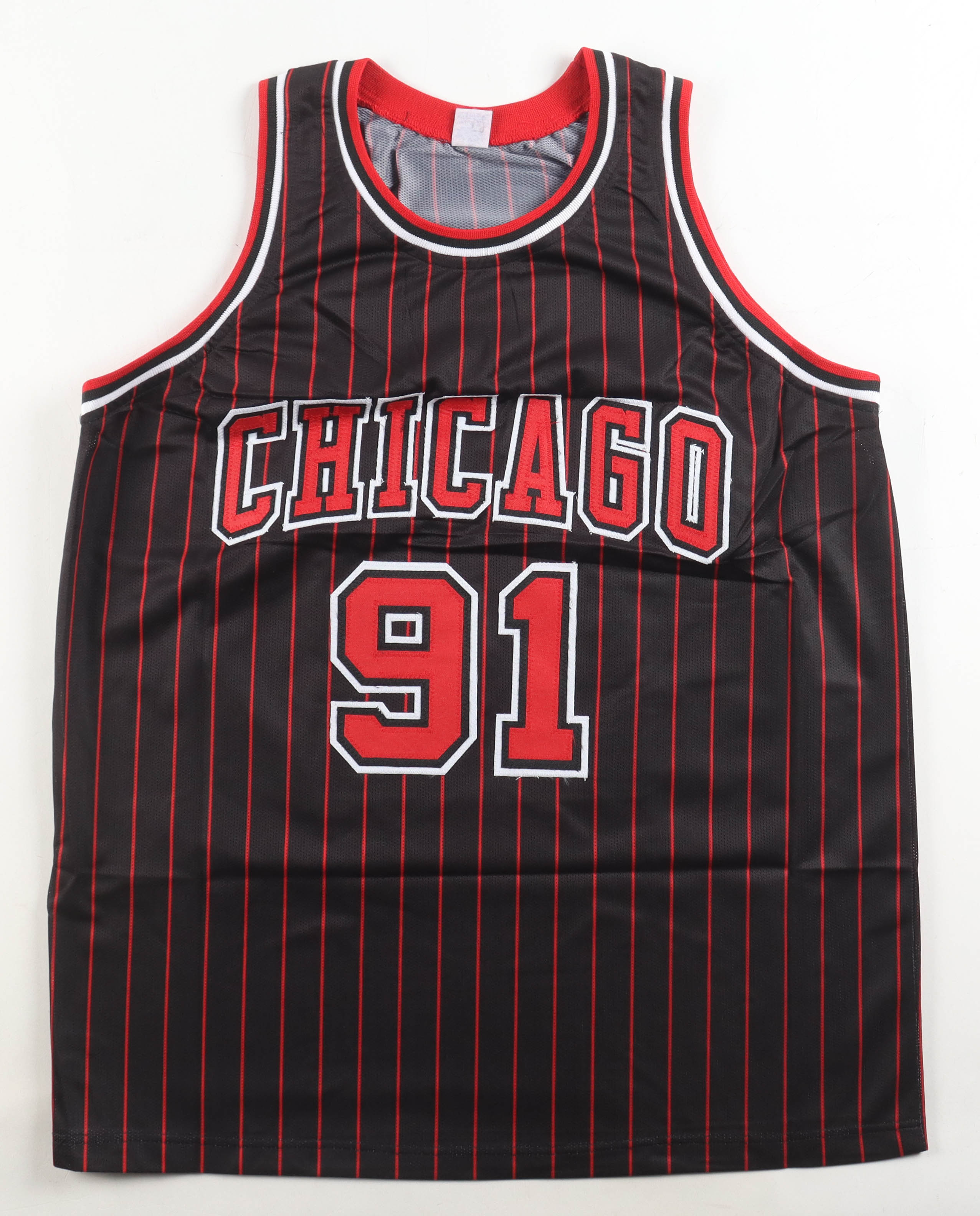 Custom jersey with everything sewn on, size XL. Hand-signed by Dennis Rodman (HOF).