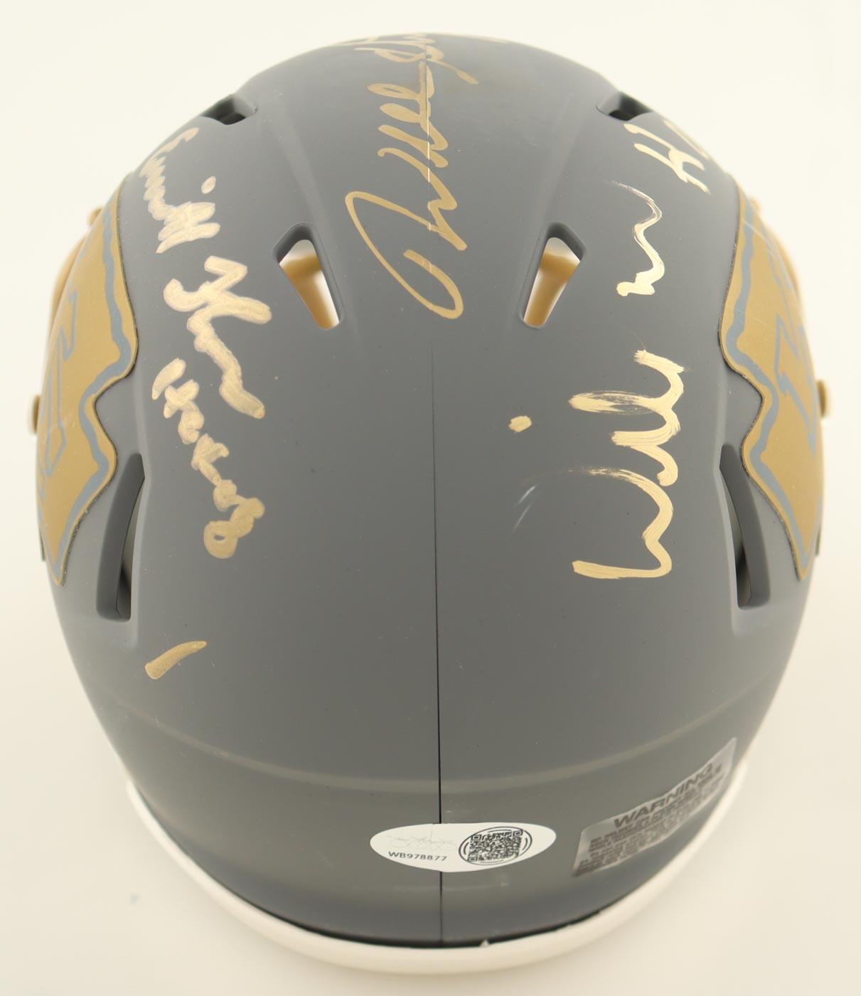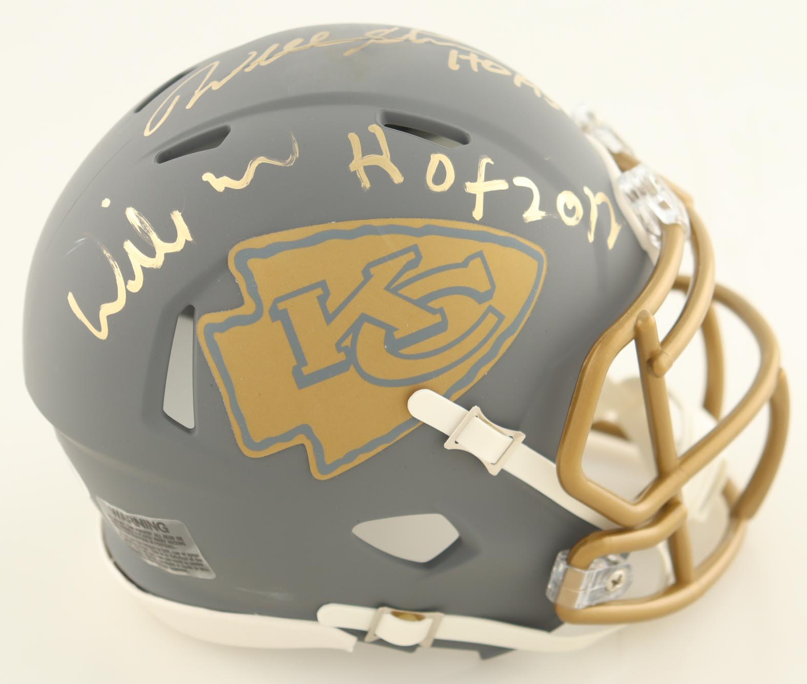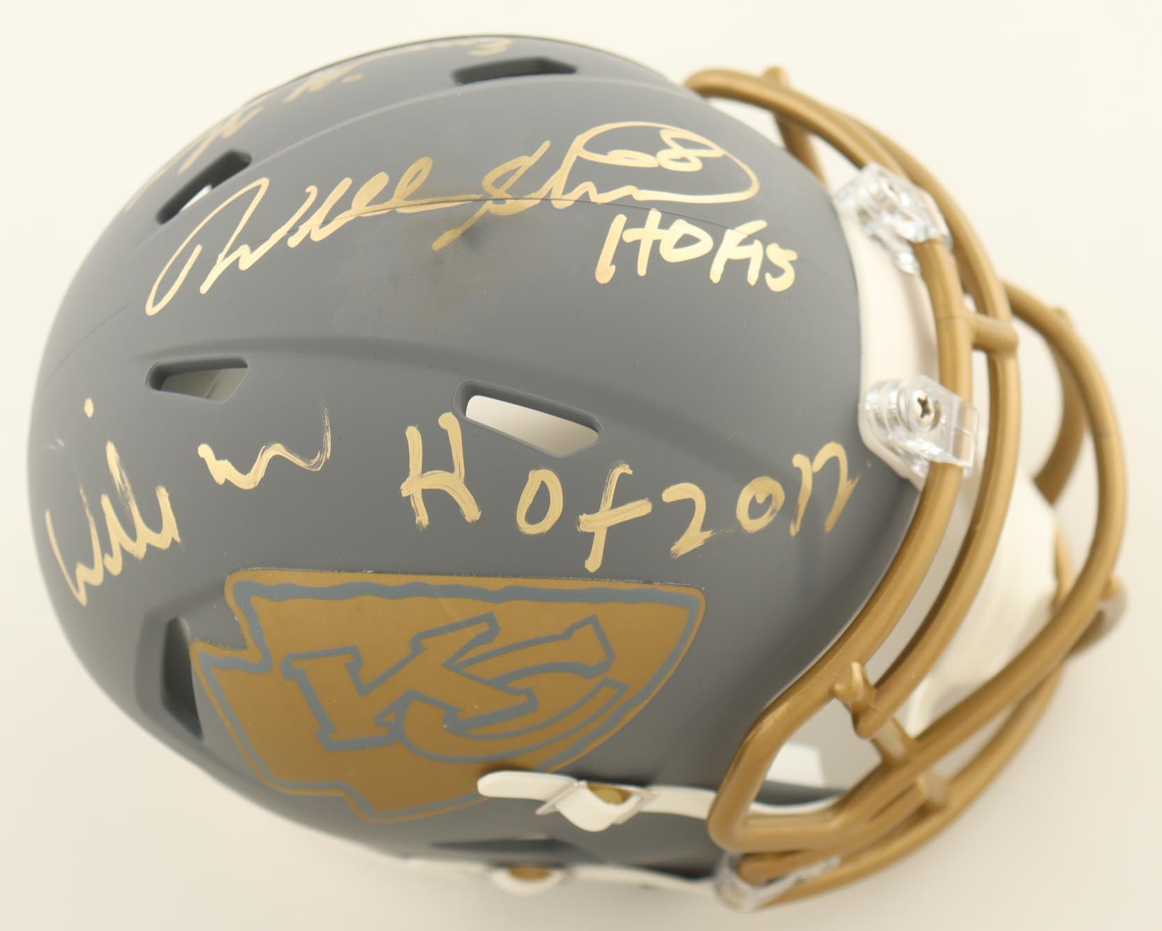 Riddell Kansas City Chiefs Slate Alternate Speed mini helmet. Hand-signed and inscribed by Willie Roaf (HOF), Will Shields (HOF) and Emmitt Thomas (HOF). Please note, there is some scuffing on the helmet.