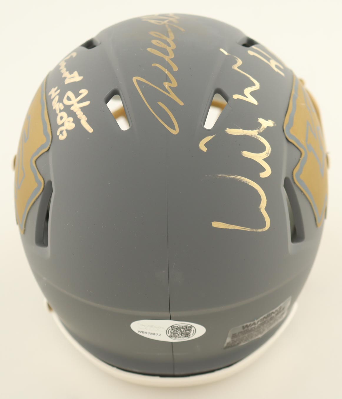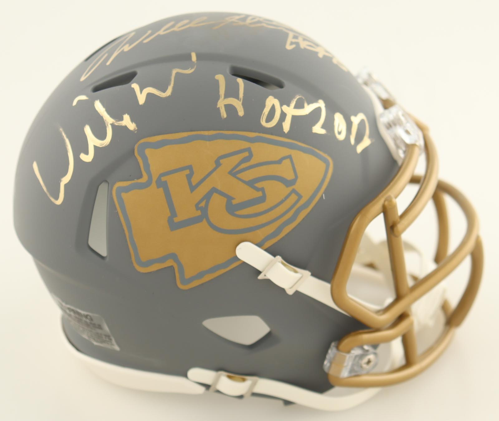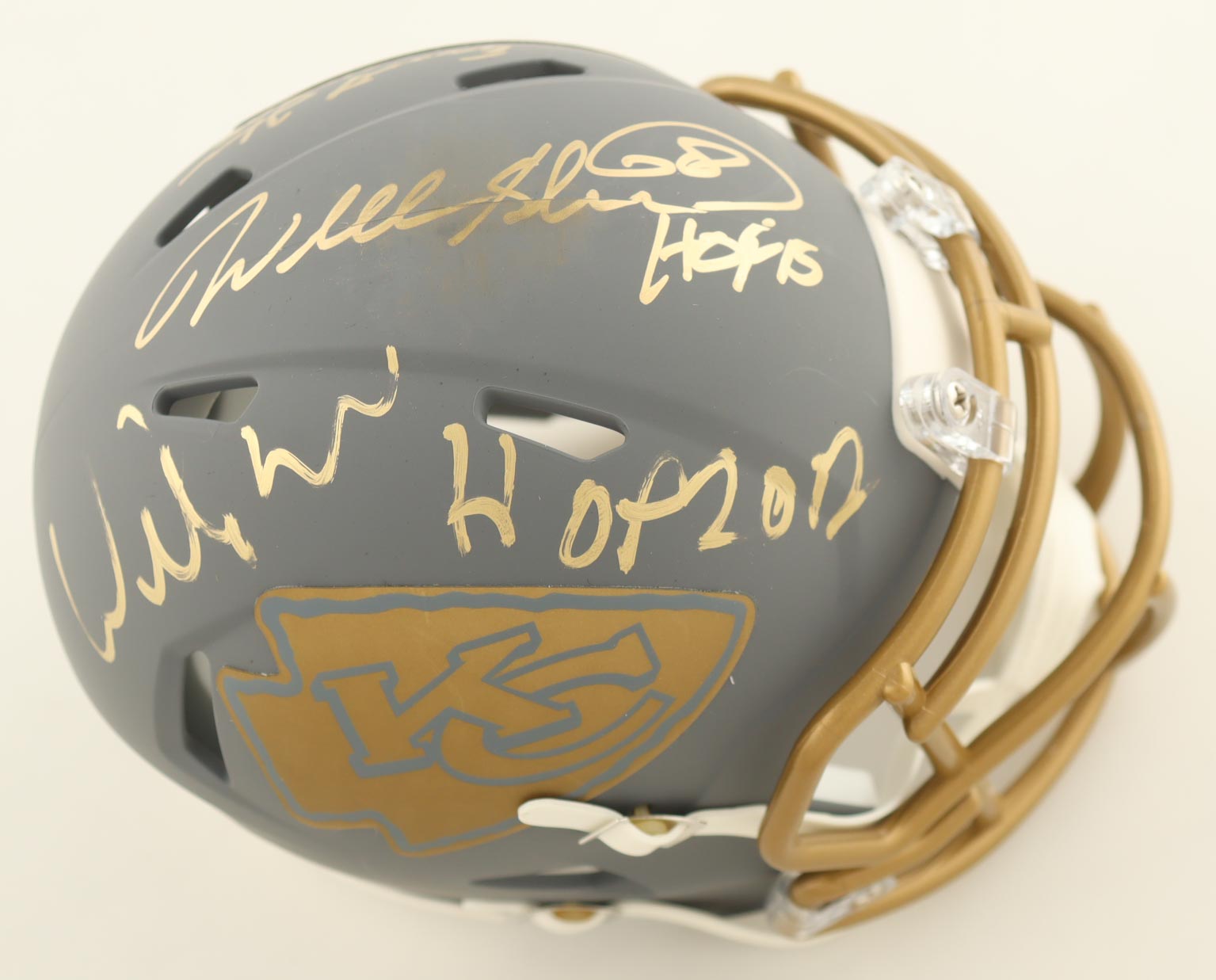 Riddell Kansas City Chiefs Slate Alternate Speed mini helmet. Hand-signed and inscribed by Willie Roaf (HOF), Will Shields (HOF) and Emmitt Thomas (HOF). Please note, there is some scuffing on the helmet.