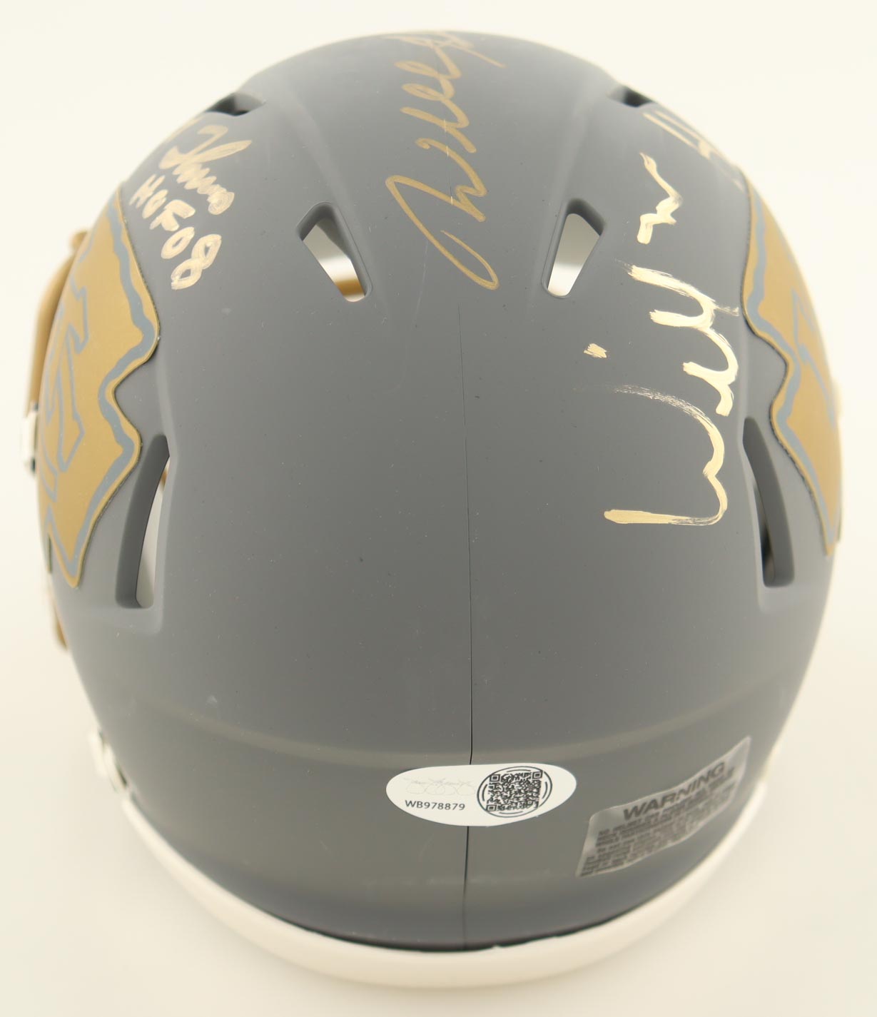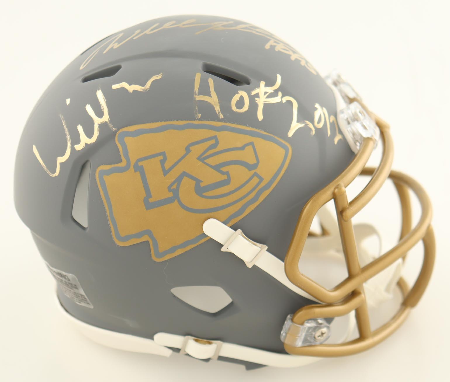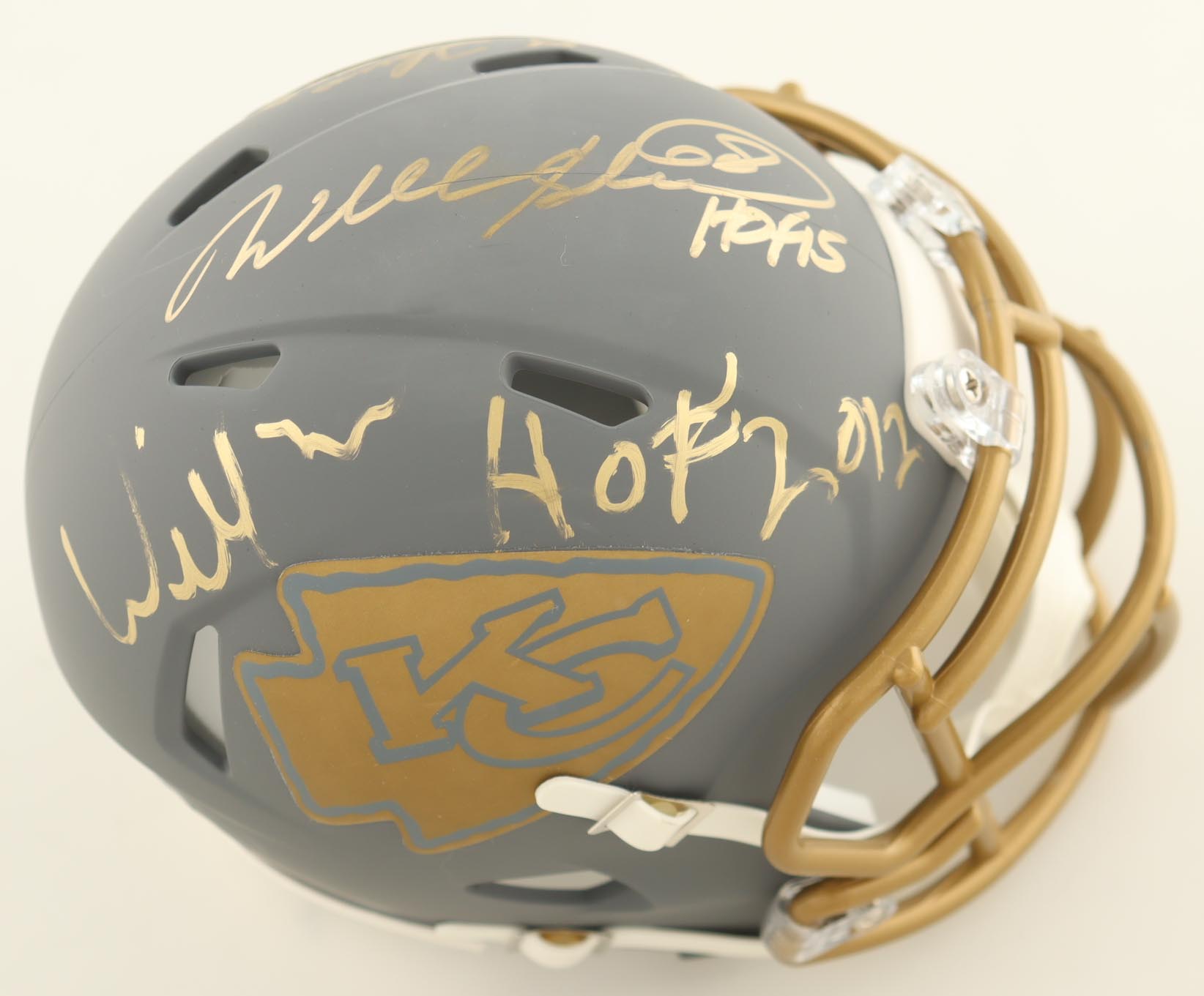 Riddell Kansas City Chiefs Slate Alternate Speed mini helmet. Hand-signed and inscribed by Willie Roaf (HOF), Will Shields (HOF) and Emmitt Thomas (HOF). Please note, there is some scuffing on the helmet.