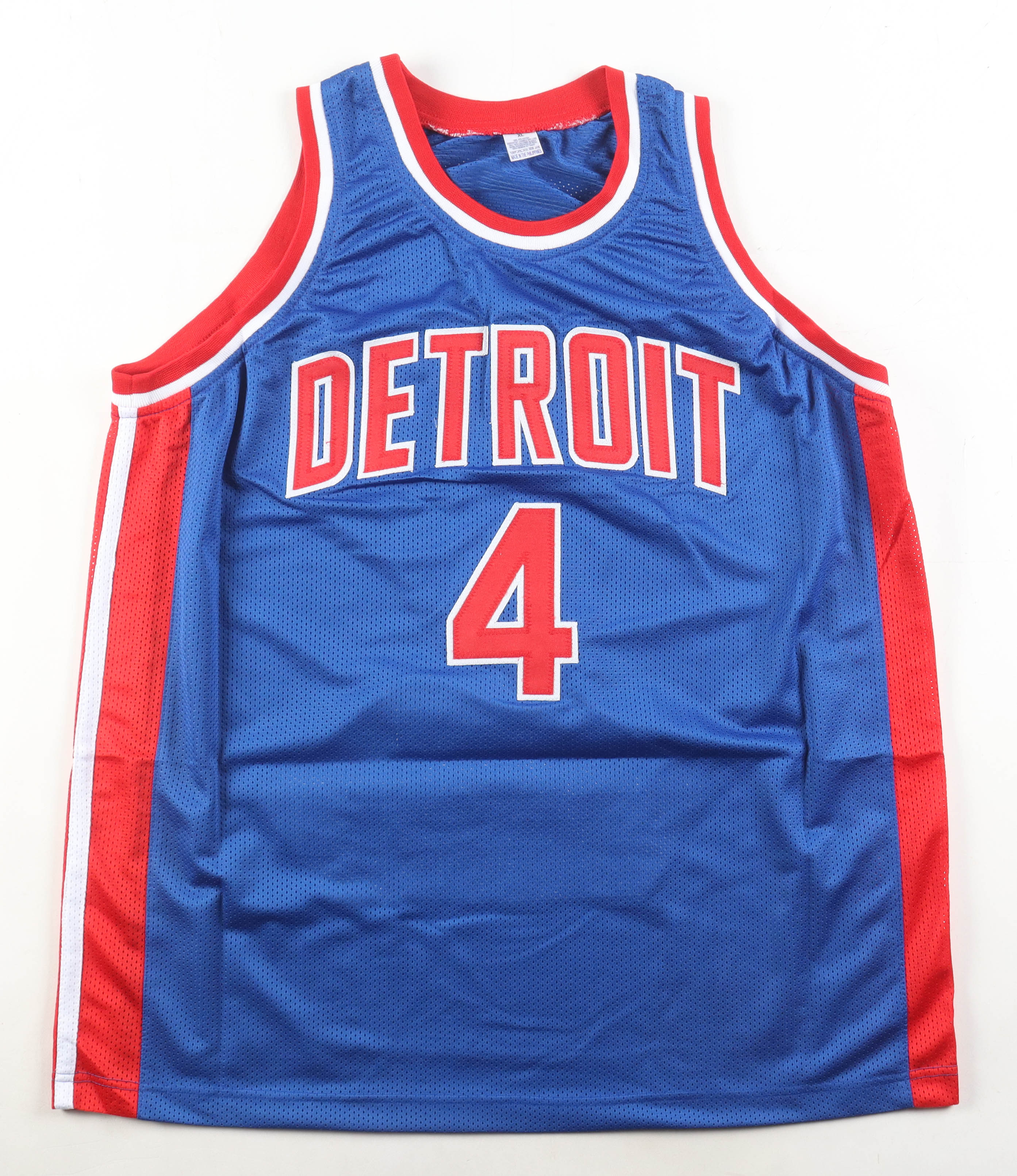 Custom jersey. Everything is sewn on, size XL. Hand-signed by Joe Dumars. Dumars' career highlights are custom stitched below the numbers on the reverse side of the jersey.
