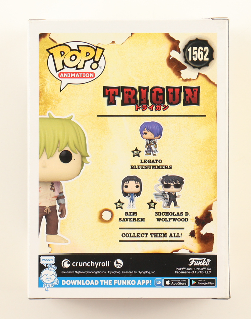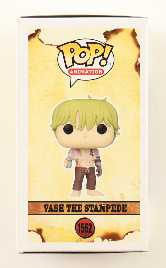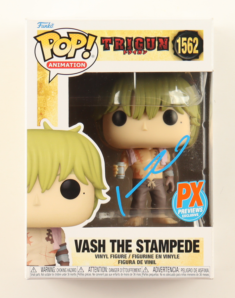 Funko pop! vinyl figure measures approximately 4" tall and has been hand-signed on the packaging by Johnny Yong Bosch (Vash the Stampede).