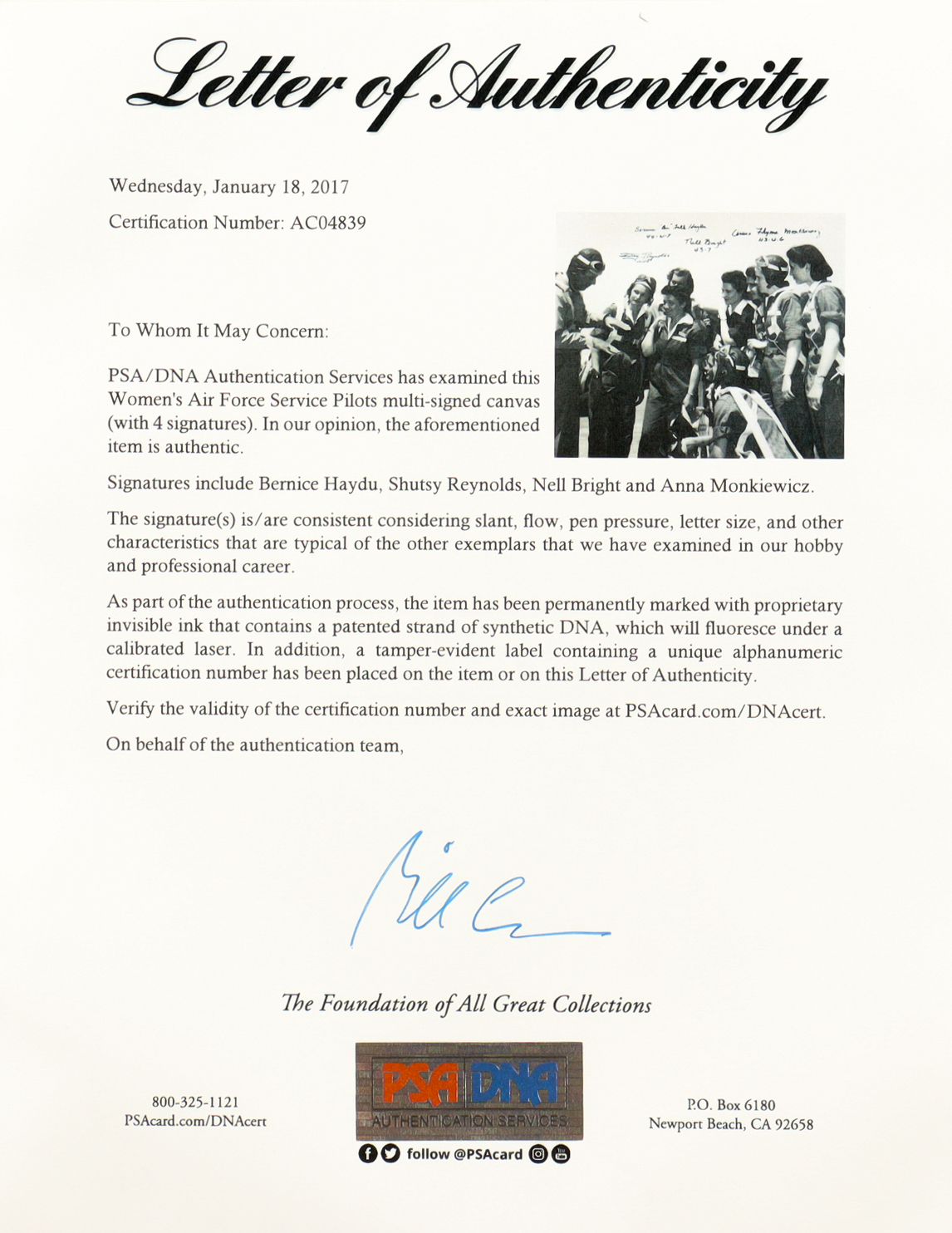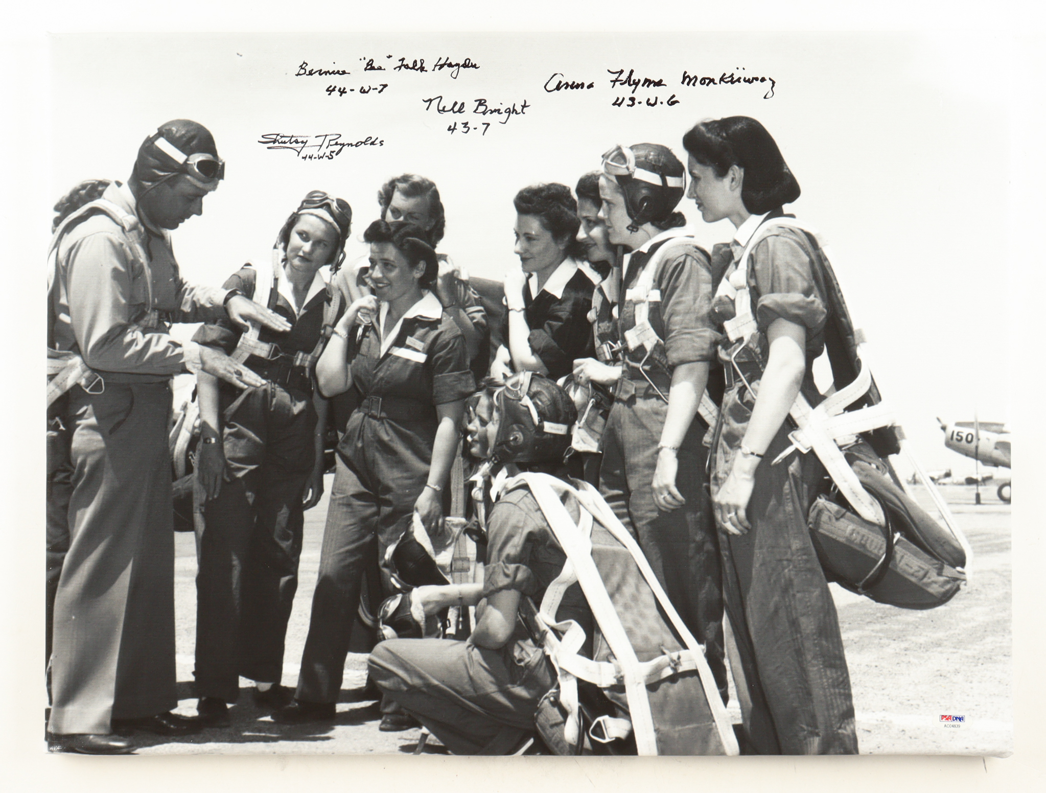 Offered for auction is an exceptional **18x24 canvas print**, **personally hand signed in permanent marker** by four pioneering **World War II Women’s Airforce Service Pilots (WASP)** — **Anna Mankiewicz, Nell Bright, Bernice ""Bee"" Haydu, and Shutsy Reynolds**. This powerful tribute to the legacy of the WASP program is **authenticated by PSA/DNA Authentication Services** and includes their **Letter of Authenticity**.