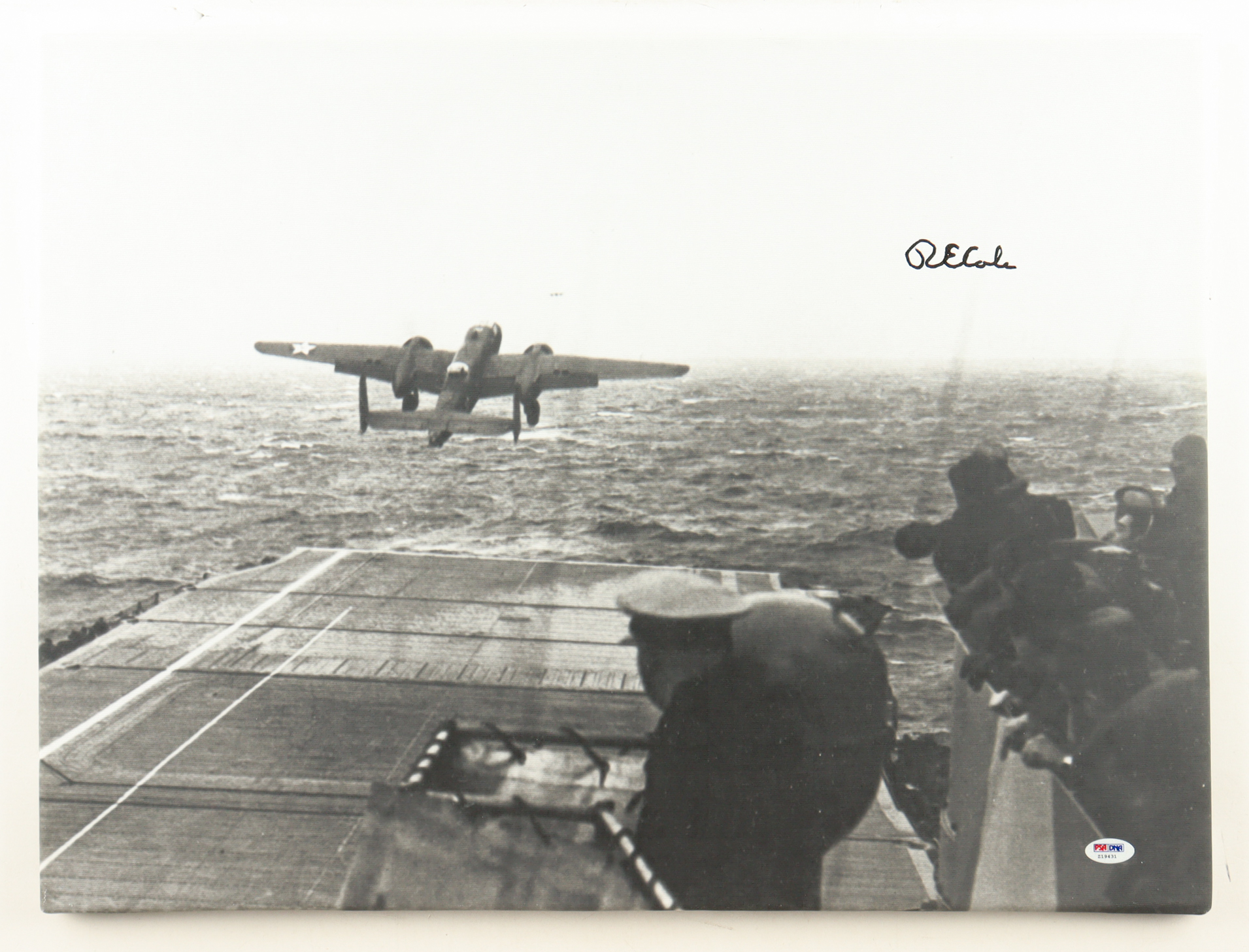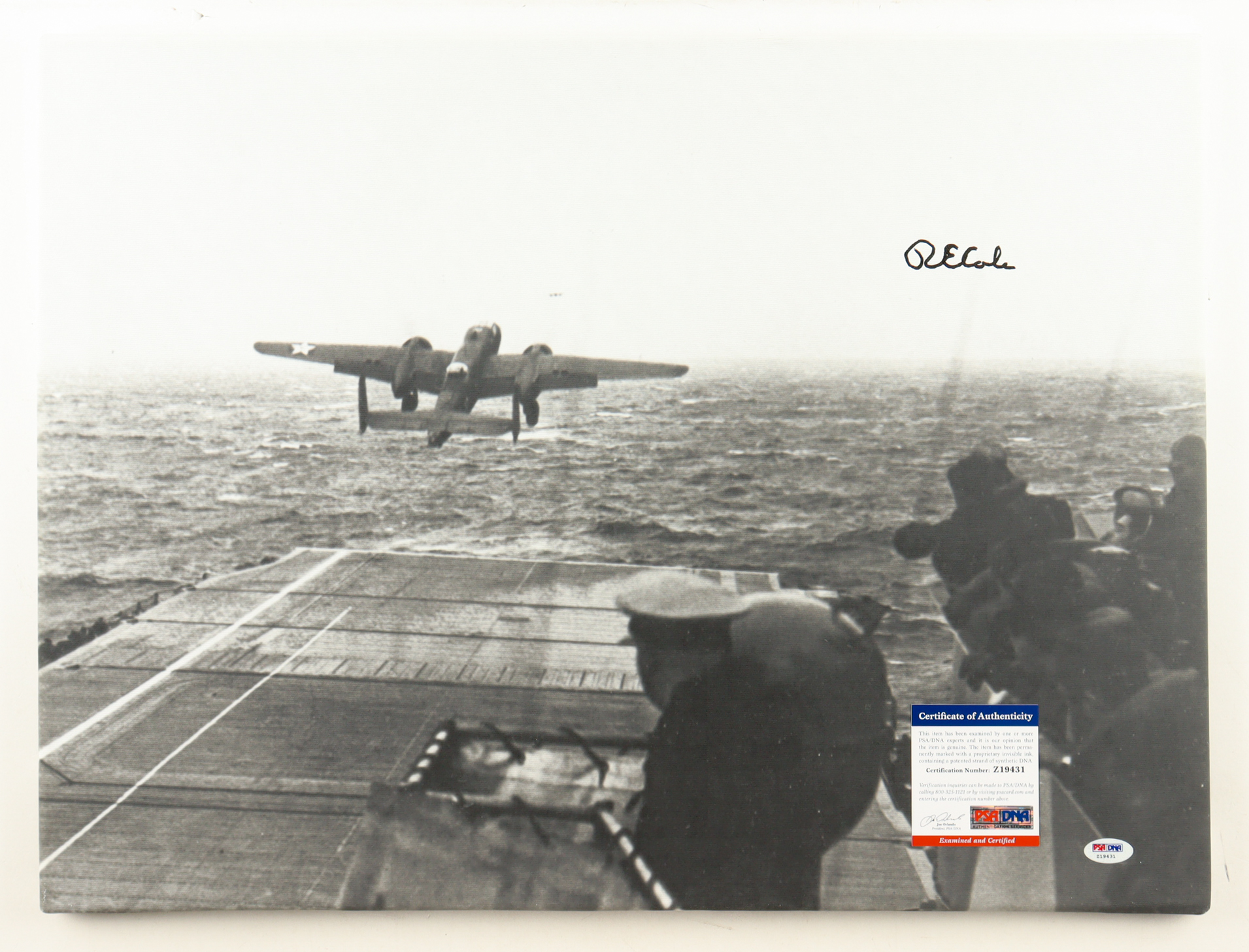 Presented for auction is an extraordinary **18x24 unframed canvas print** **hand signed in permanent marker** by **Lieutenant Colonel Richard E. Cole**, co-pilot of **Plane #1** during the historic **Doolittle Raid on Tokyo**, April 18, 1942. This rare and commemorative piece comes **authenticated by PSA/DNA Authentication Services** and includes their **Certificate of Authenticity**.