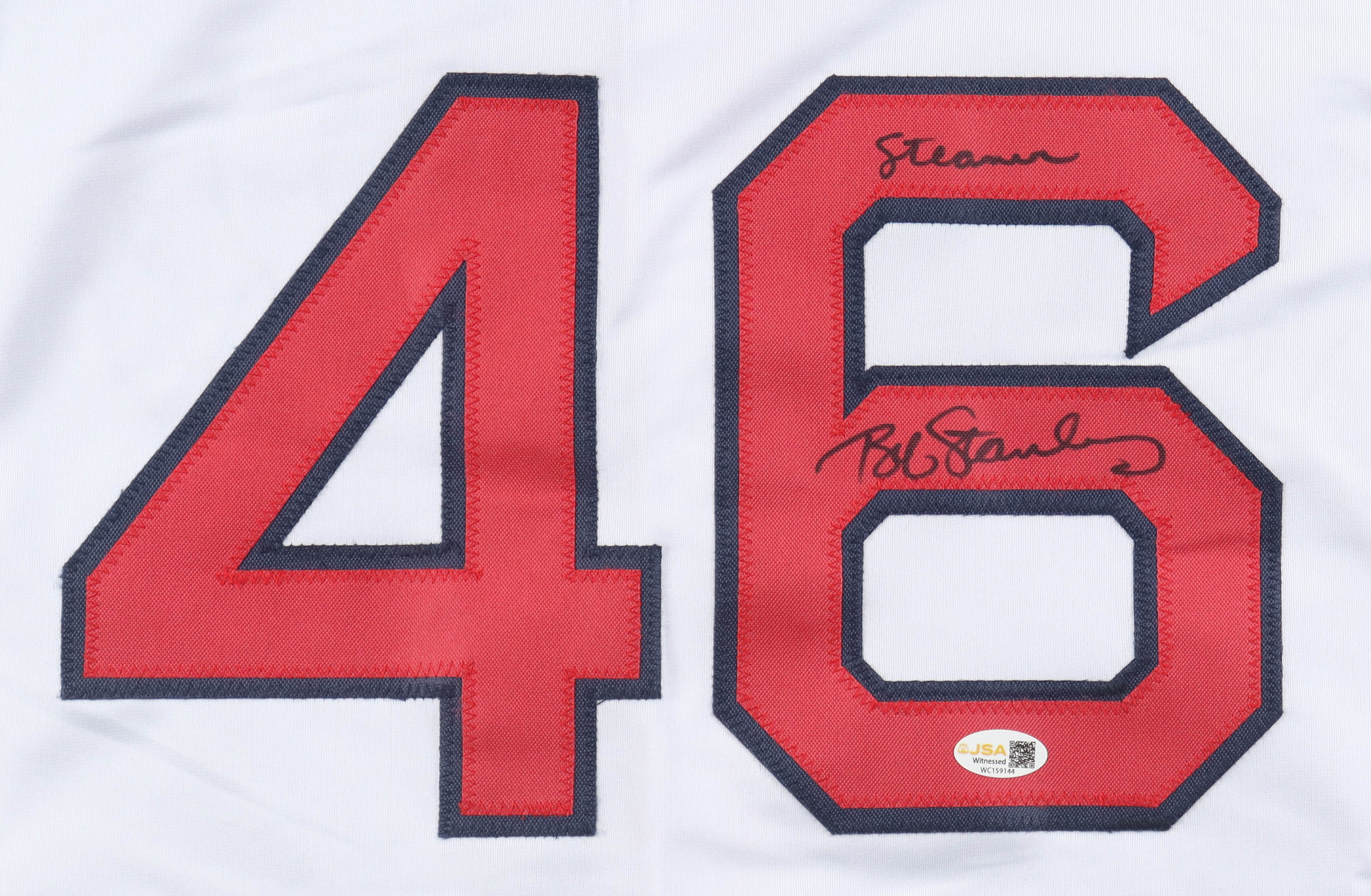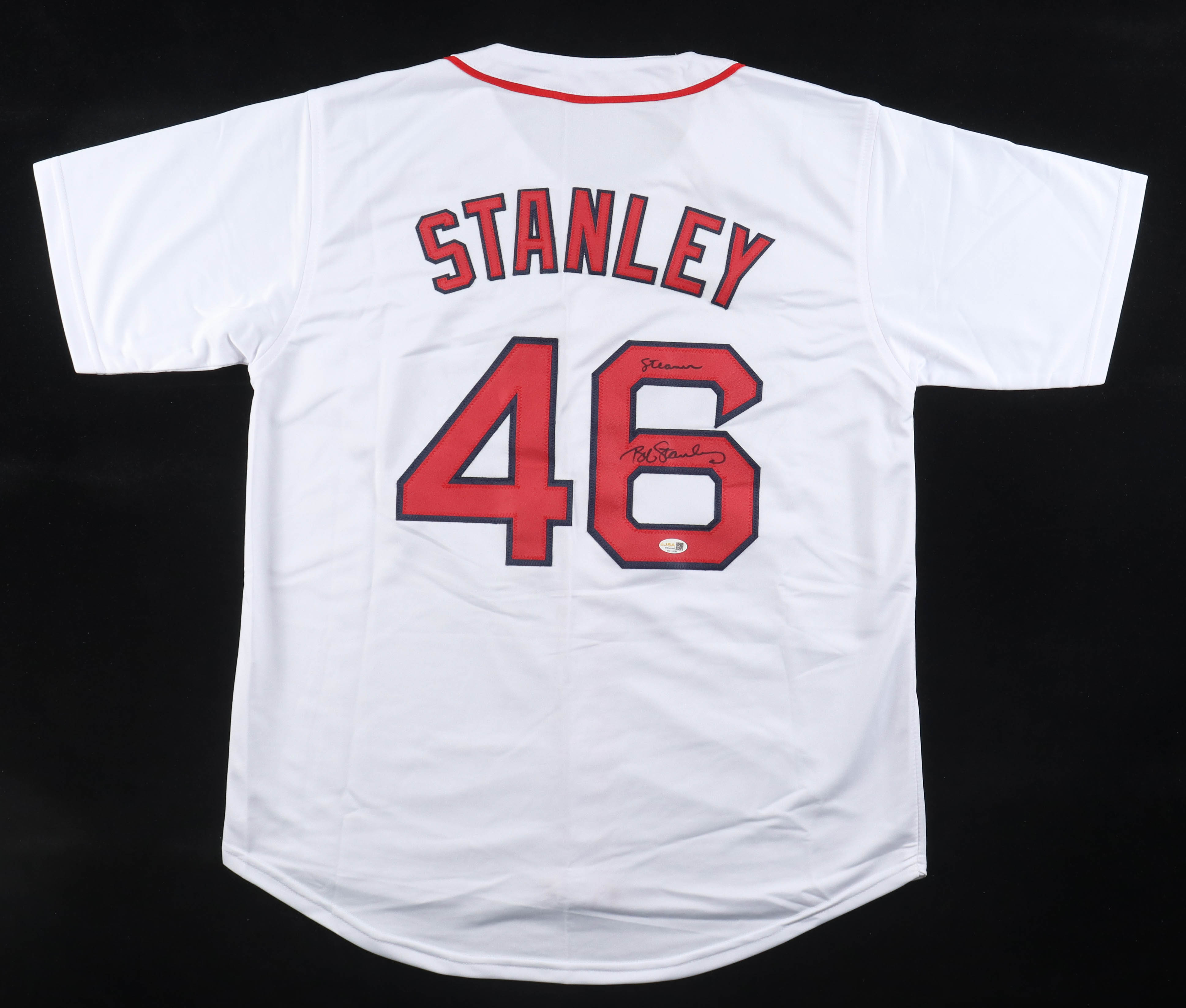 Custom jersey with everything sewn on, size XL. Hand-signed ad inscribed by Bob Stanley.