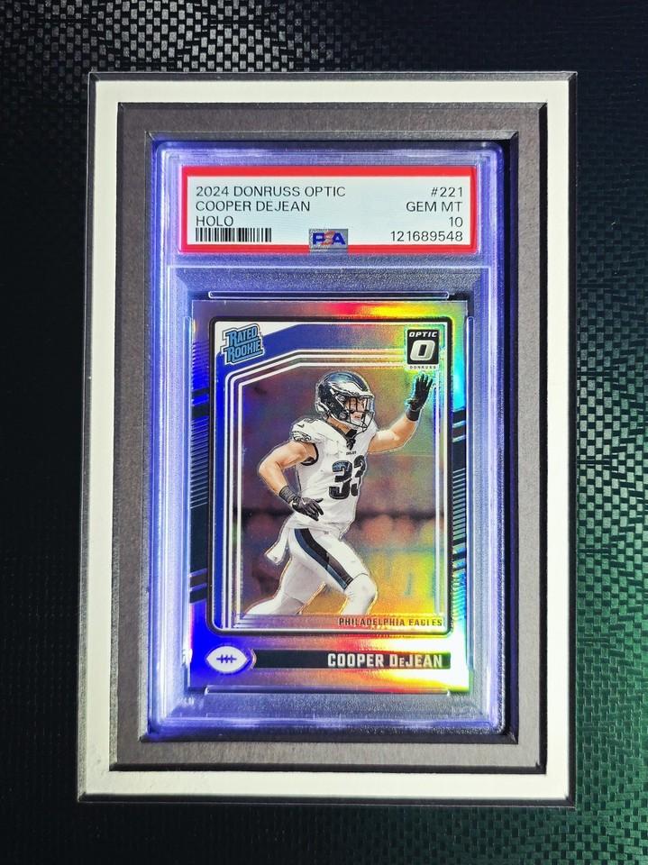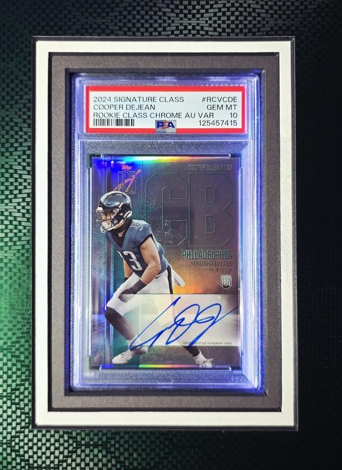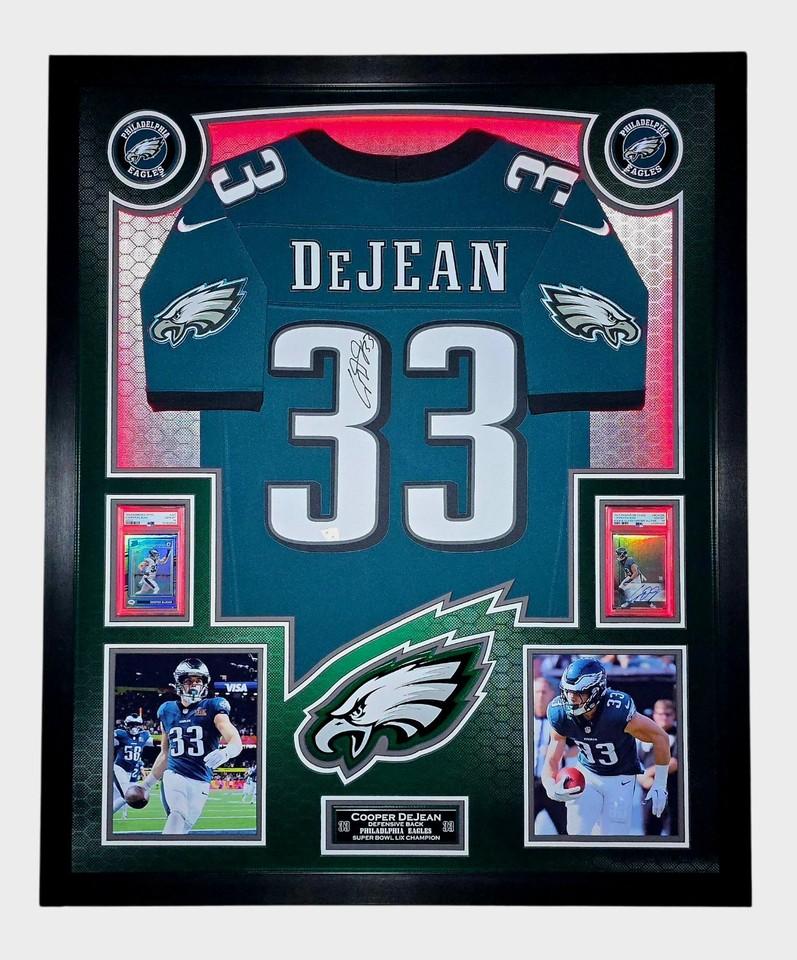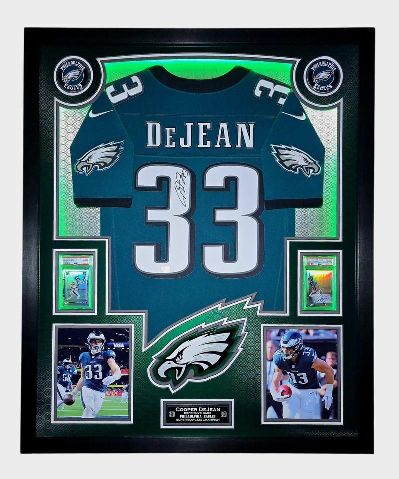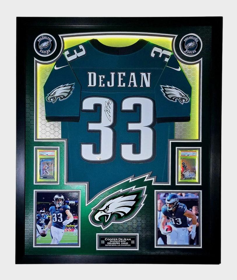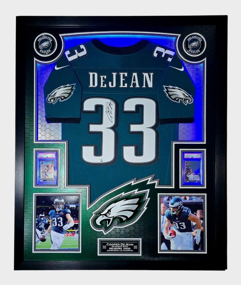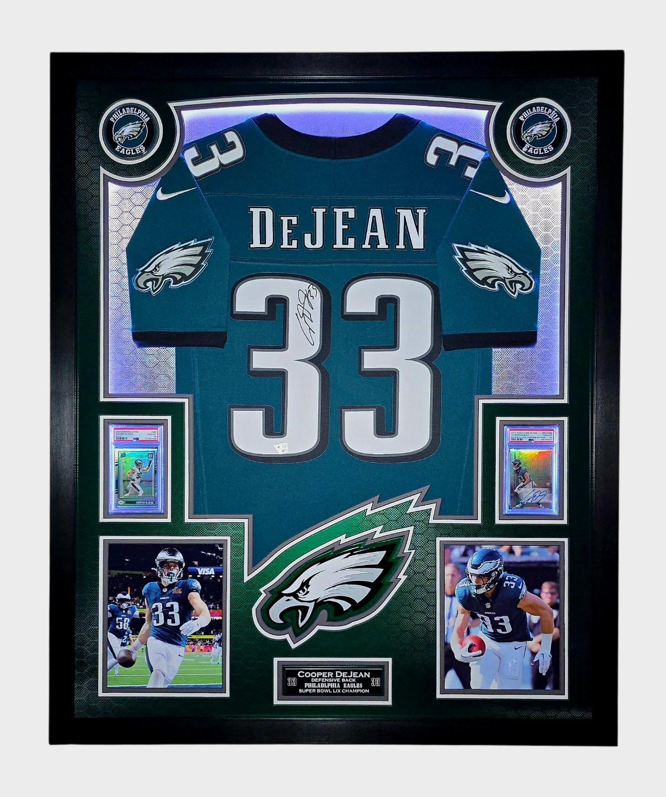 Cooper DeJean Signed Eagles Custom Framed LED Nike FUSE Jersey Display with (2) PSA 10 Graded Cards (Fanatics)