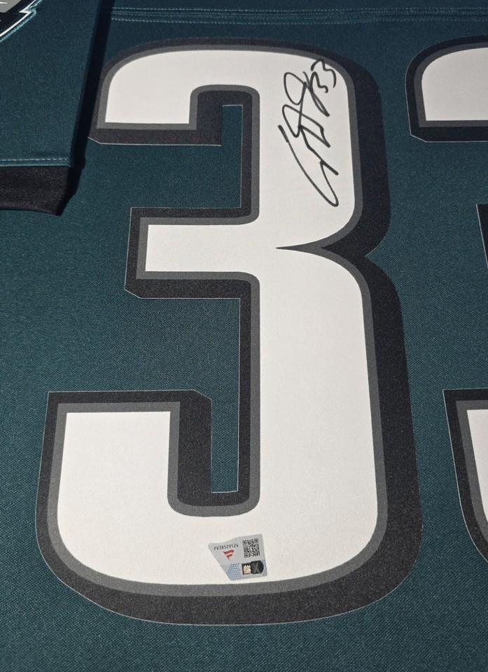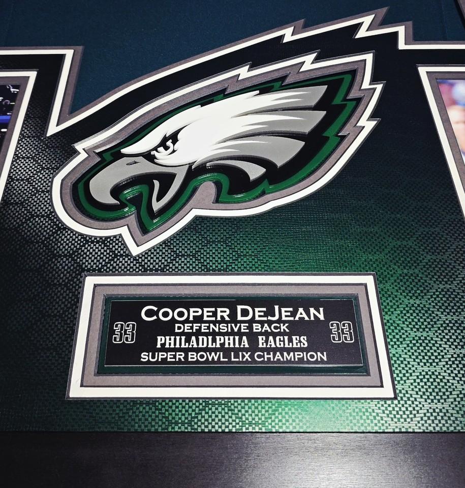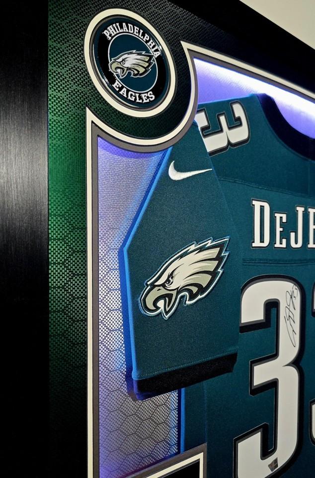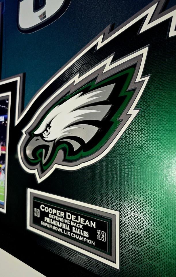 Custom frame measures 32" x 43" in size and comes installed with customizable LED backlighting. The frame features a Nike FUSE Limited jersey that has been hand-signed by Cooper DeJean (Philadelphia Eagles).