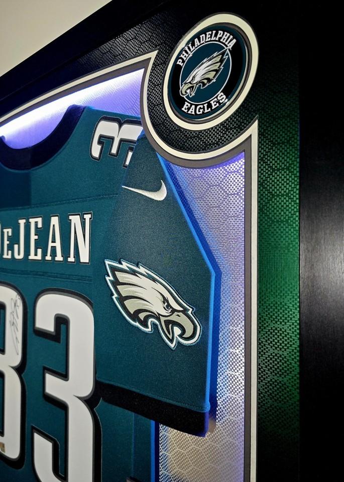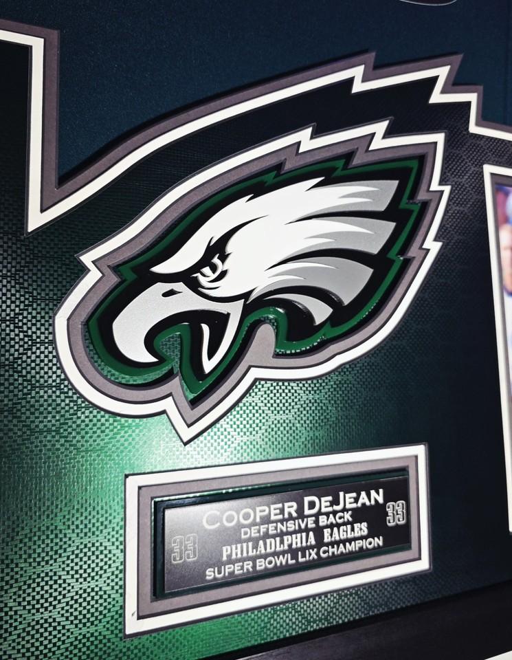 - (2) Embedded and layered 3D metal Philadelphia Eagles Logos (Top left & right)
