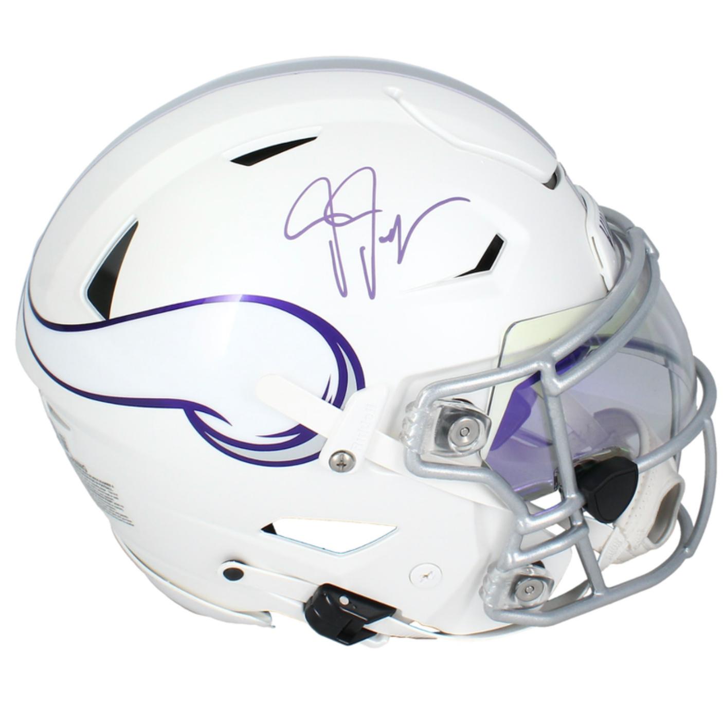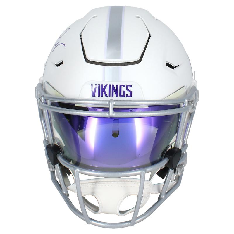 Riddell Minnesota Vikings full-size authentic on-field alternate speedflex helmet. Hand-signed by Justin Jefferson. Custom visor is included as shown.