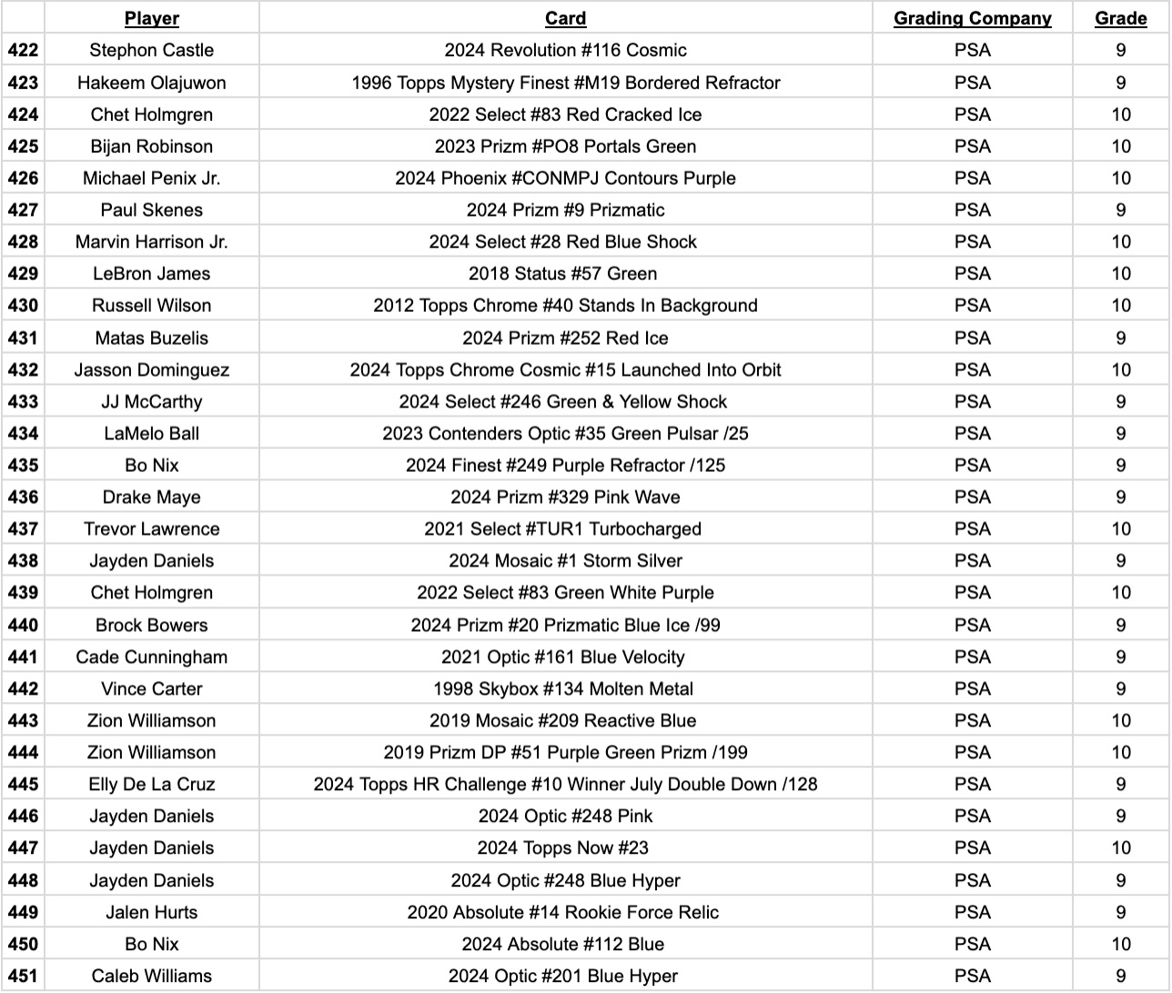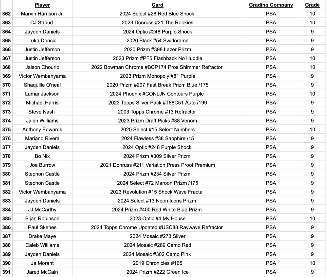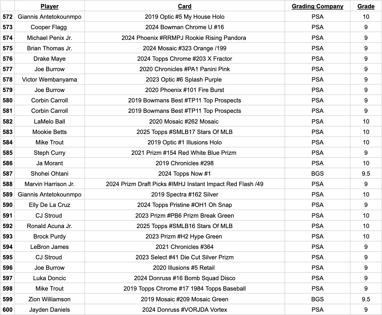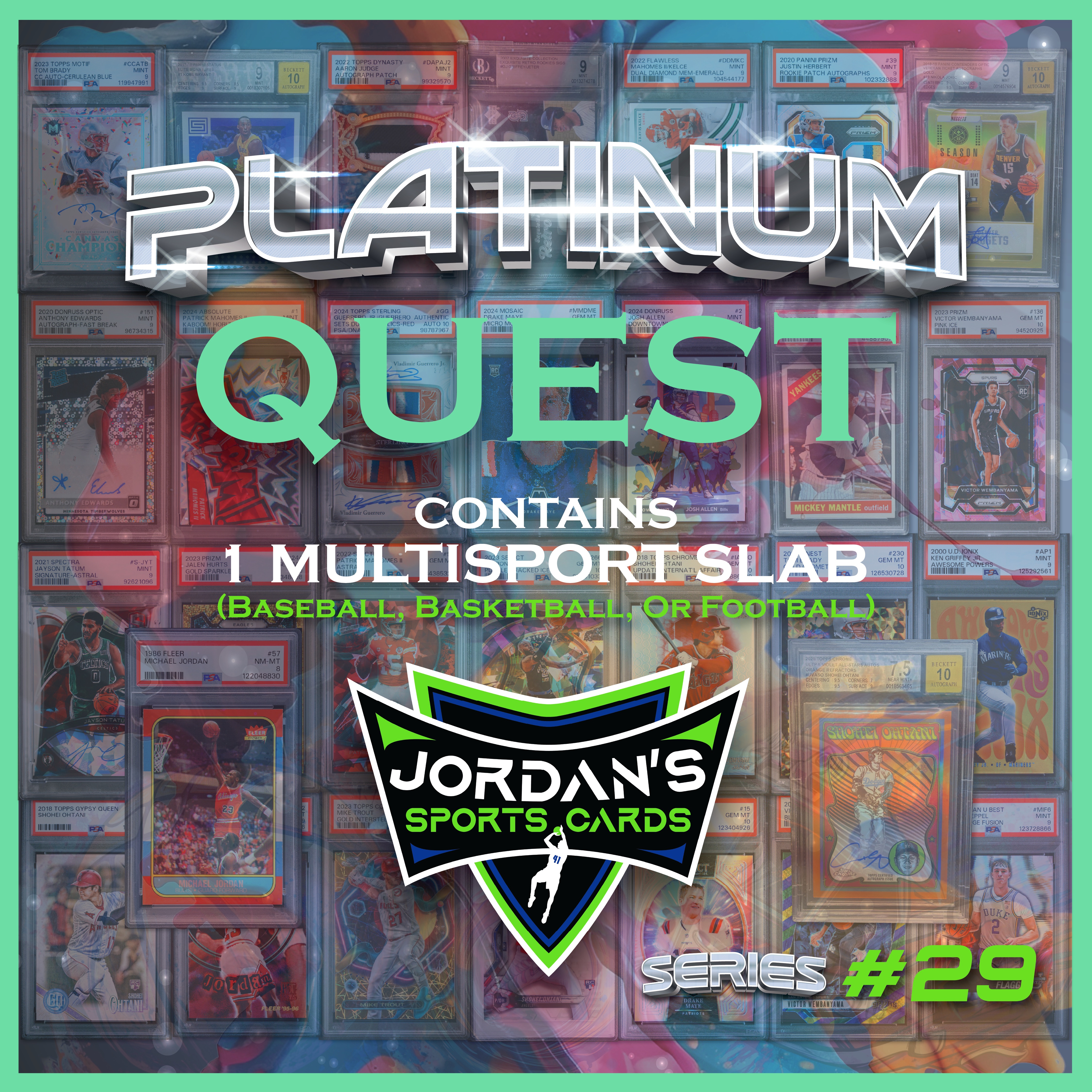Jordan’s Sports Cards Presents Platinum Quest Series 29: The Sports Card Pack Mystery Pack with (1) PSA or BGS graded baseball, basketball, or football card, including big hits from superstars and hall of famers across all three major sports (600 cards total).