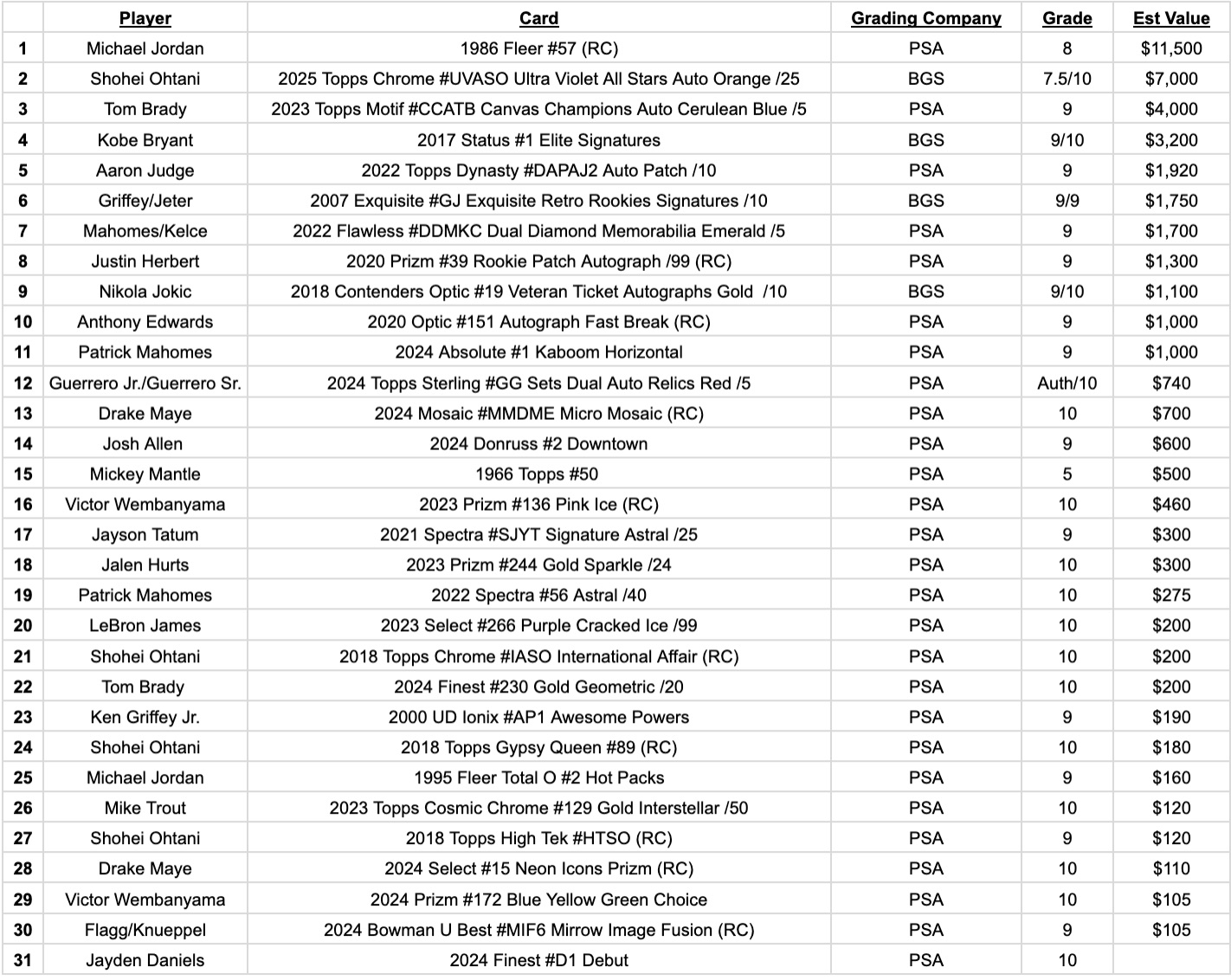 $11,500 Michael Jordan PSA 8 1986 Fleer RC (Newly Graded w/ Great Eye Appeal), $7,000 Shohei Ohtani Orange Refractor Auto /25, $4,000 Tom Brady On Card Auto /5, $3,200 Kobe Bryant On Card Auto BGS 9/10, + Much More...