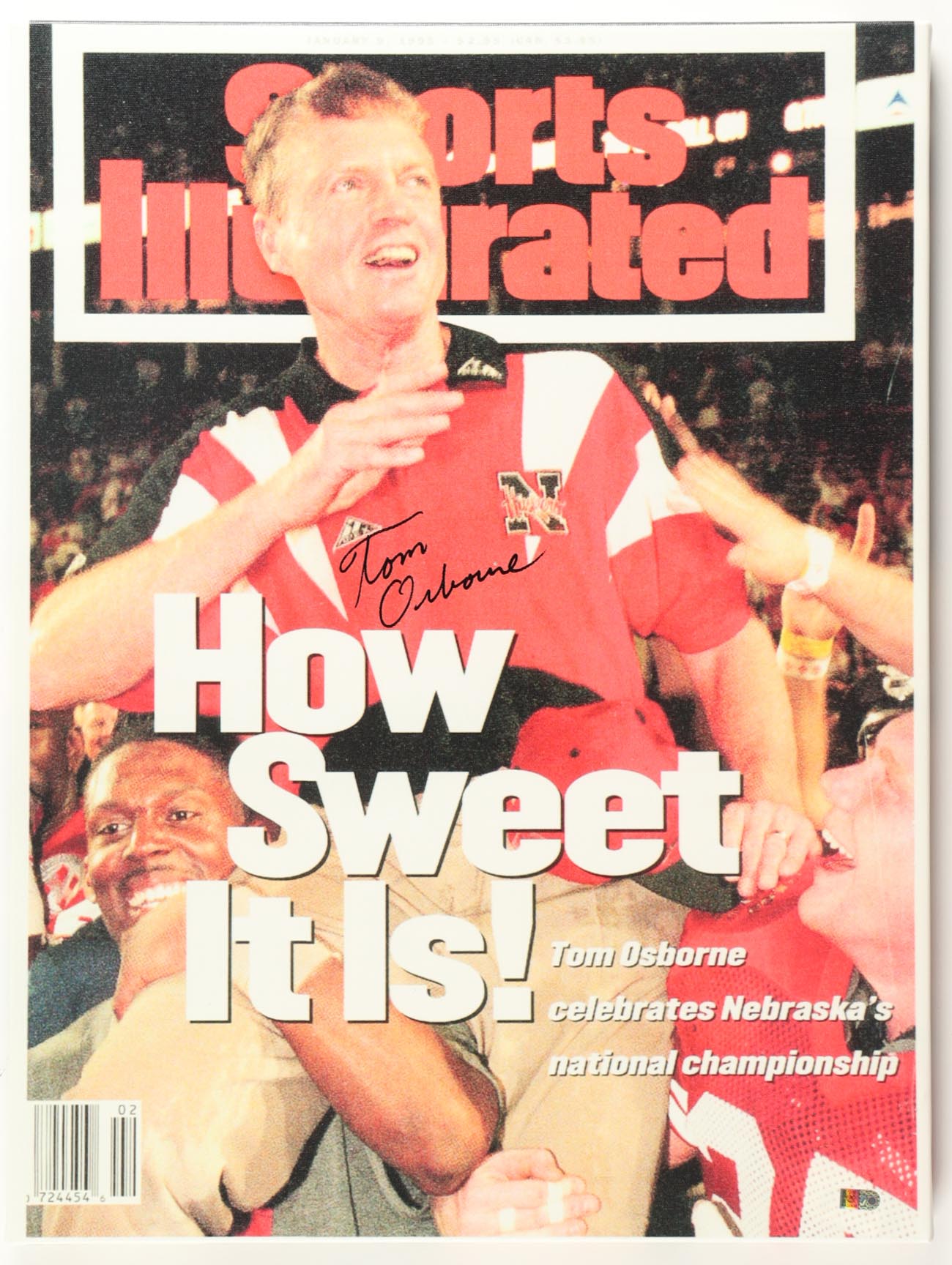 Photo on stretched canvas measures approximately 18" x 24" in size and has been hand-signed by Tom Osborne (Nebraska Cornhuskers). Please note, there is a crease in the middle right side of the canvas.