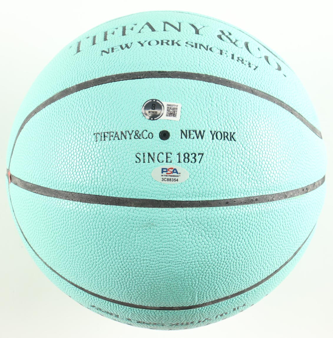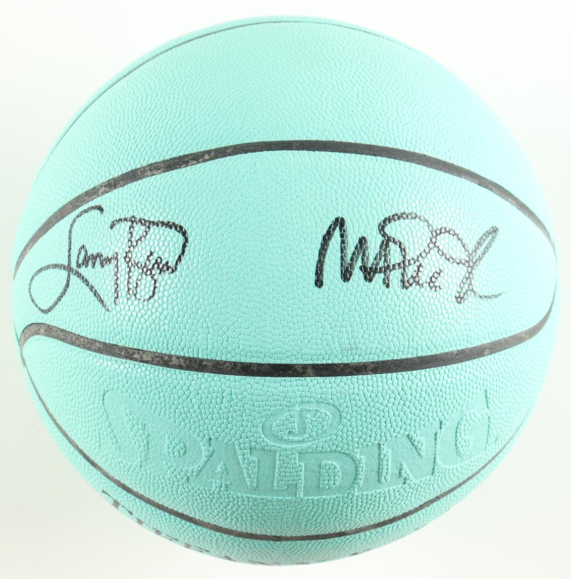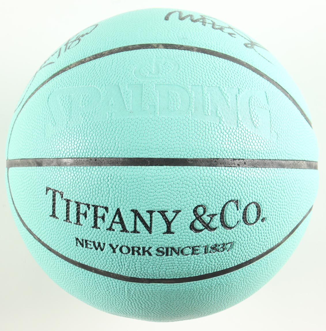 Spalding Tiffany & Co Edition basketball With Display Stand has been hand-signed by Larry Bird (Boston Celtics, HOF) & Magic Johnson (Los Angeles Lakers, HOF).