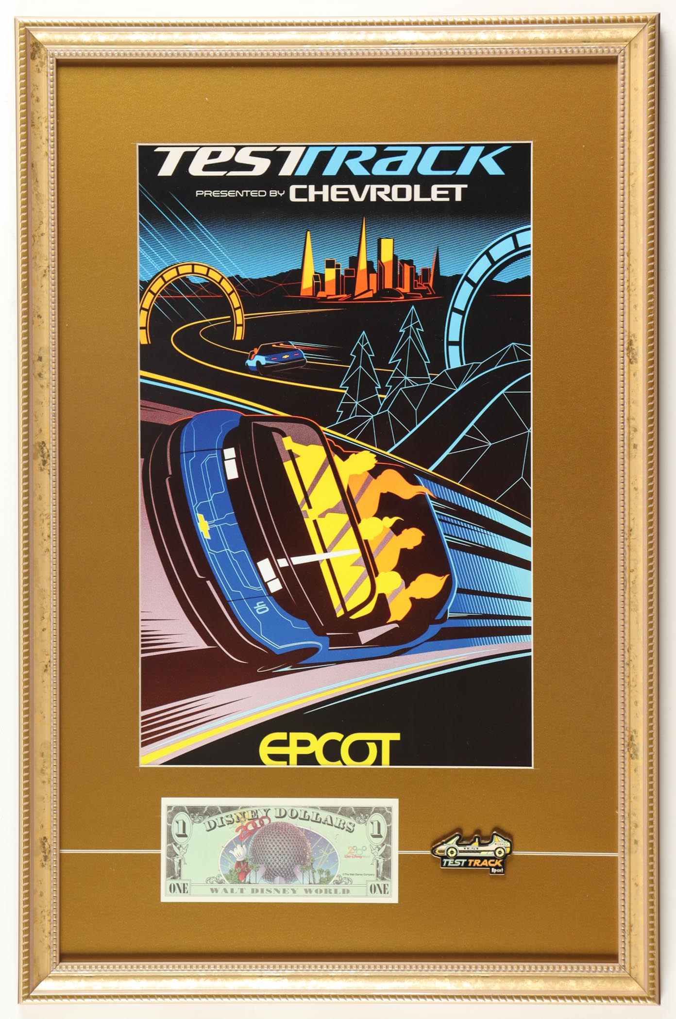 Disney World Test Track Custom Framed Photo Display with Test Track Ride Pin & Vintage Unused Epcot Dollar