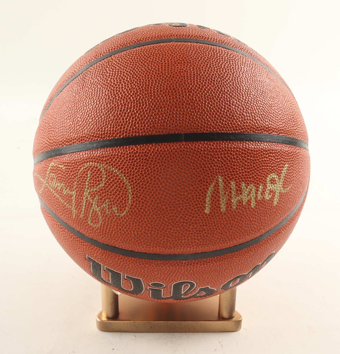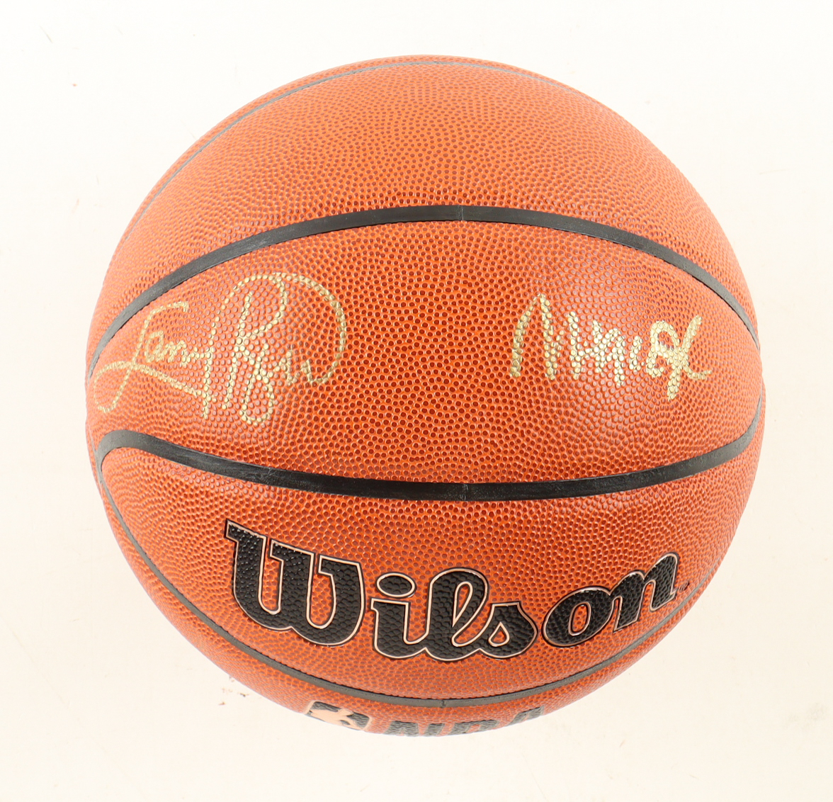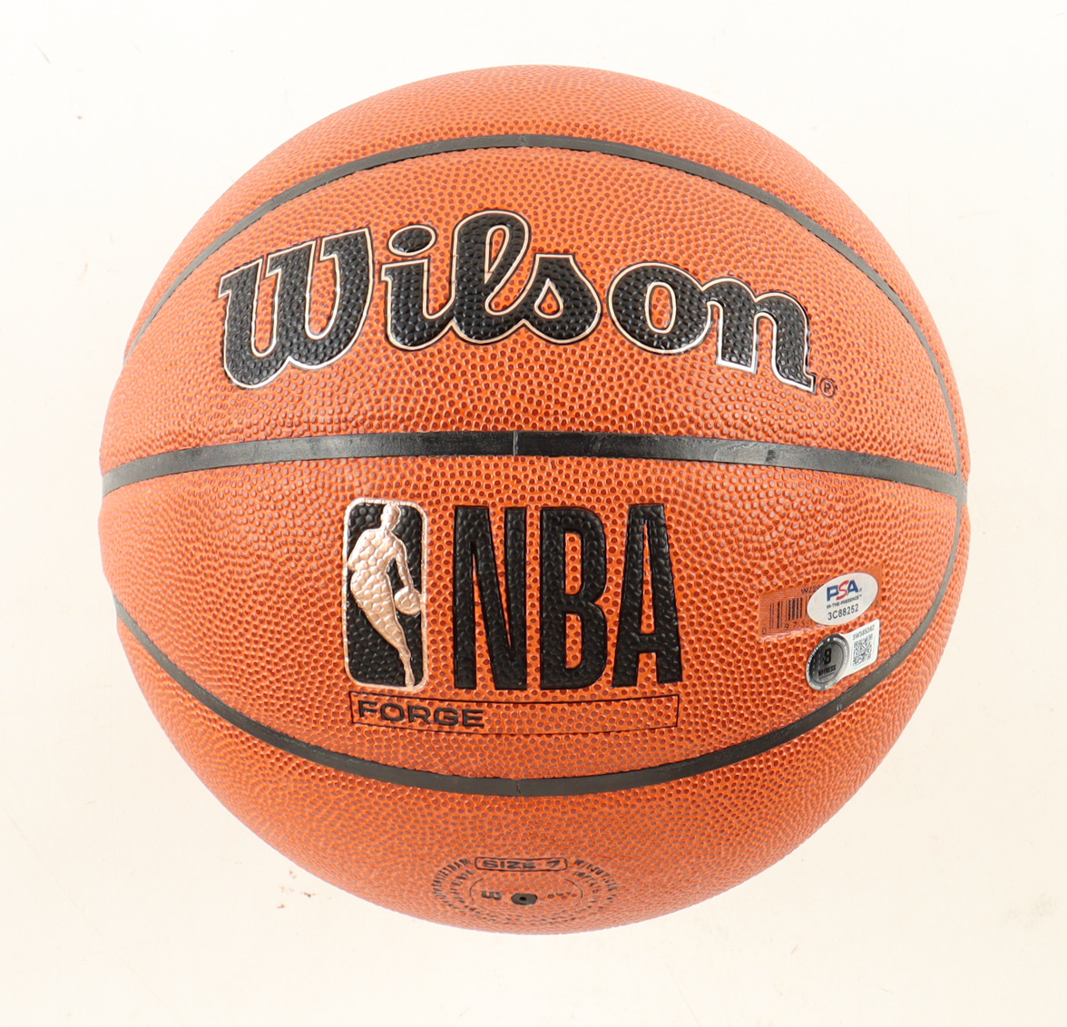 Wilson NBA Forge basketball With Display Stand has been hand-signed by Larry Bird (Boston Celtics, HOF) & Magic Johnson (Los Angeles Lakers, HOF).