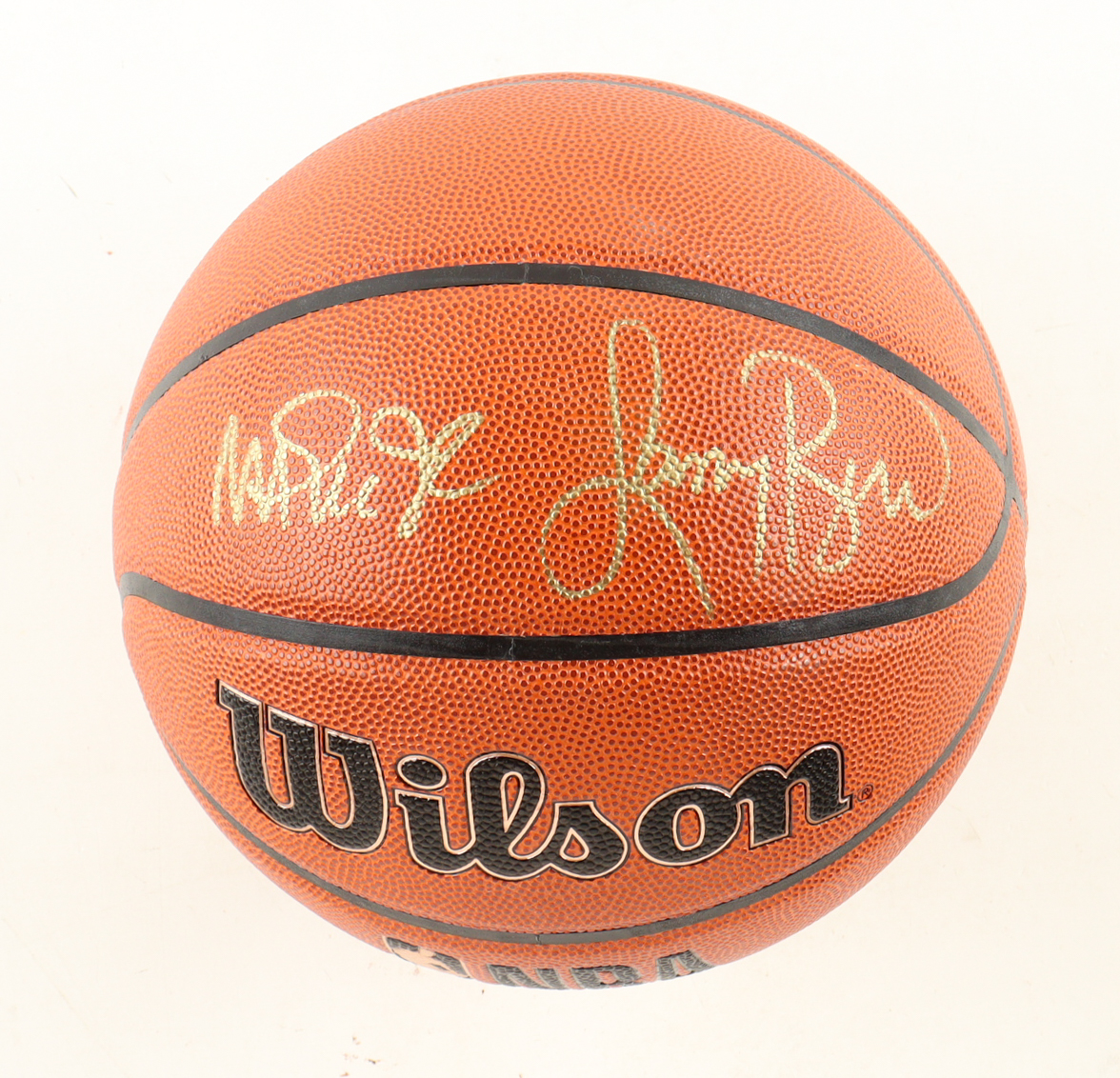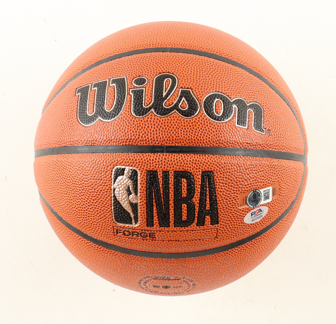 Wilson NBA Forge basketball With Display Stand has been hand-signed by Larry Bird (Boston Celtics, HOF) & Magic Johnson (Los Angeles Lakers, HOF).