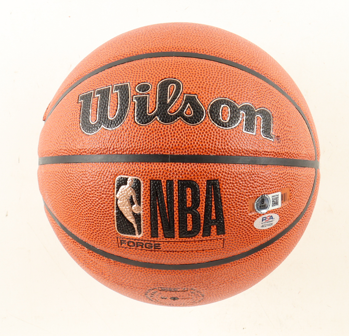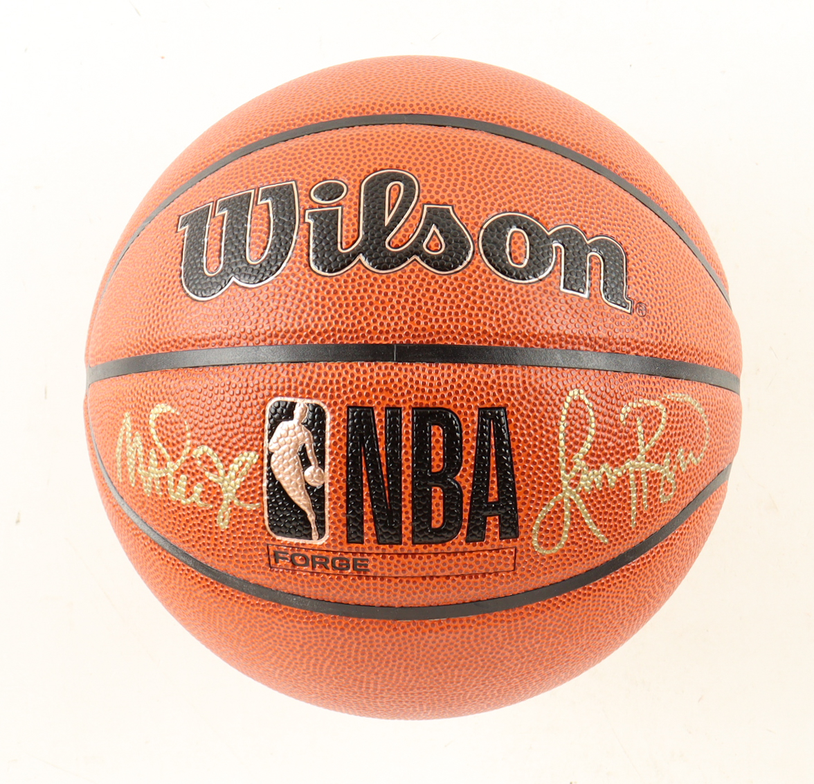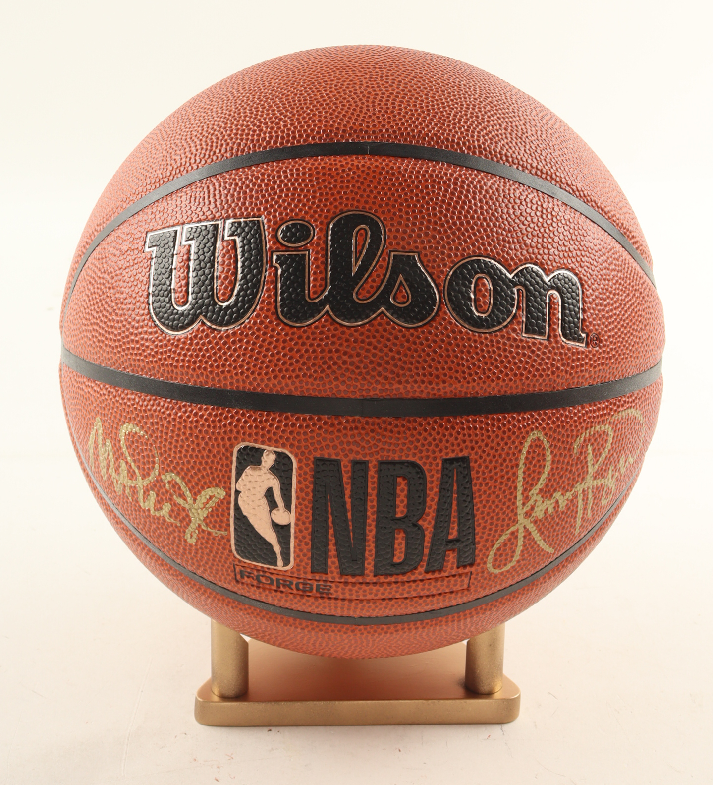 Wilson NBA Forge basketball With Display Stand has been hand-signed by Larry Bird (Boston Celtics, HOF) & Magic Johnson (Los Angeles Lakers, HOF). Please note there are stray marks and scratches on the ball, see photos for more details.