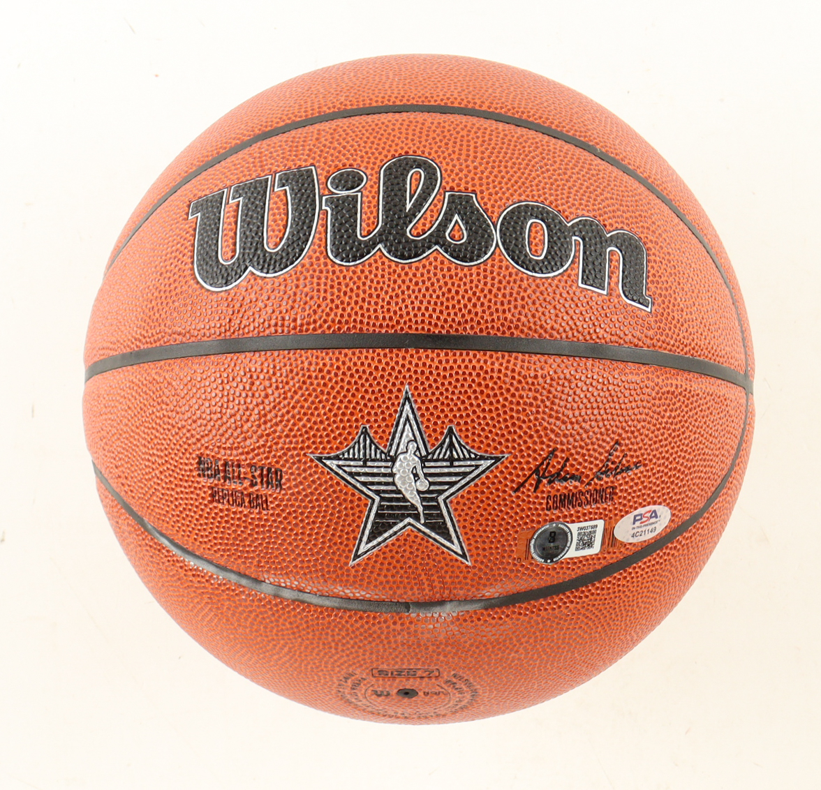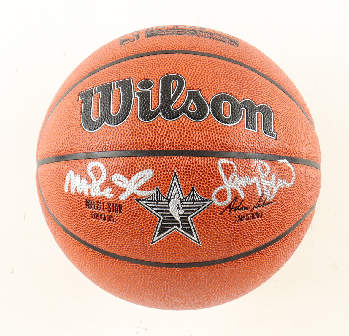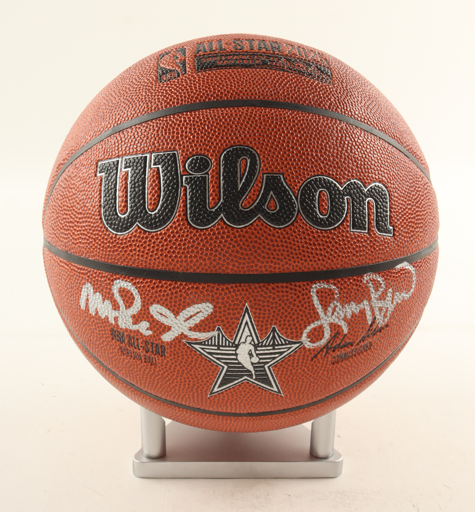 Wilson 2025 All-Star replica basketball. Hand-signed by Magic Johnson (Los Angeles Lakers, HOF) and Larry Bird (Boston Celtics, HOF). The display stand is included as shown.