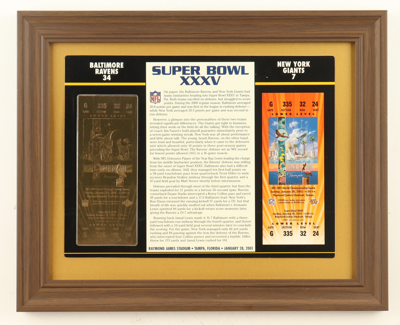 Custom frame measures approximately 13" x 16" in size. The display features a Super Bowl XXXV Commemorative Score Card with 23KT Gold Ticket. Please note, the display is unsigned.