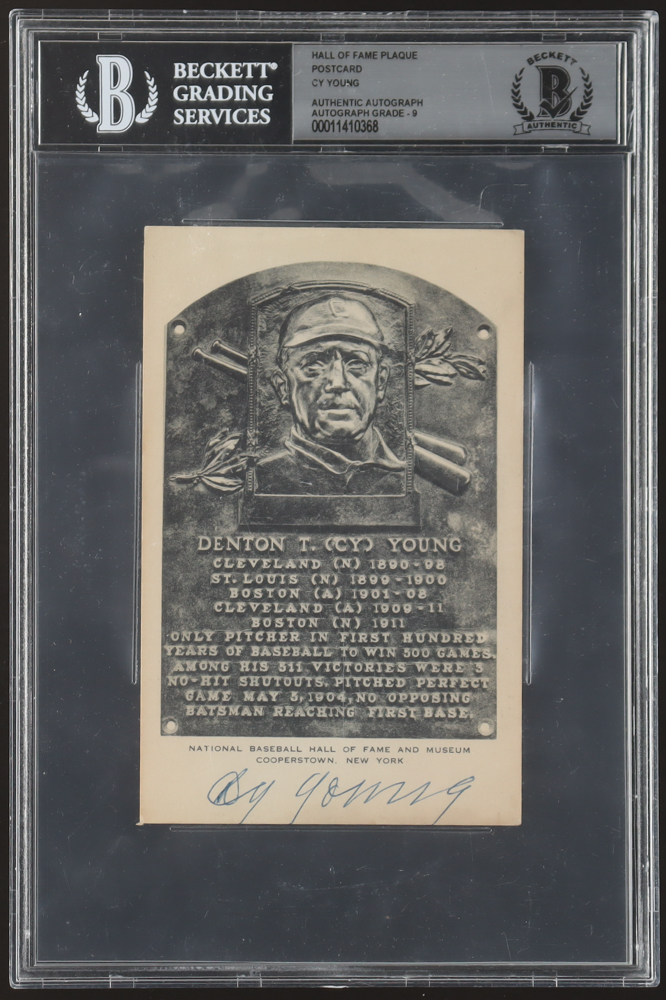 Cy Young Signed Hall Of Fame Plaque Type 1 Postcard (BGS Auto Grade 9)