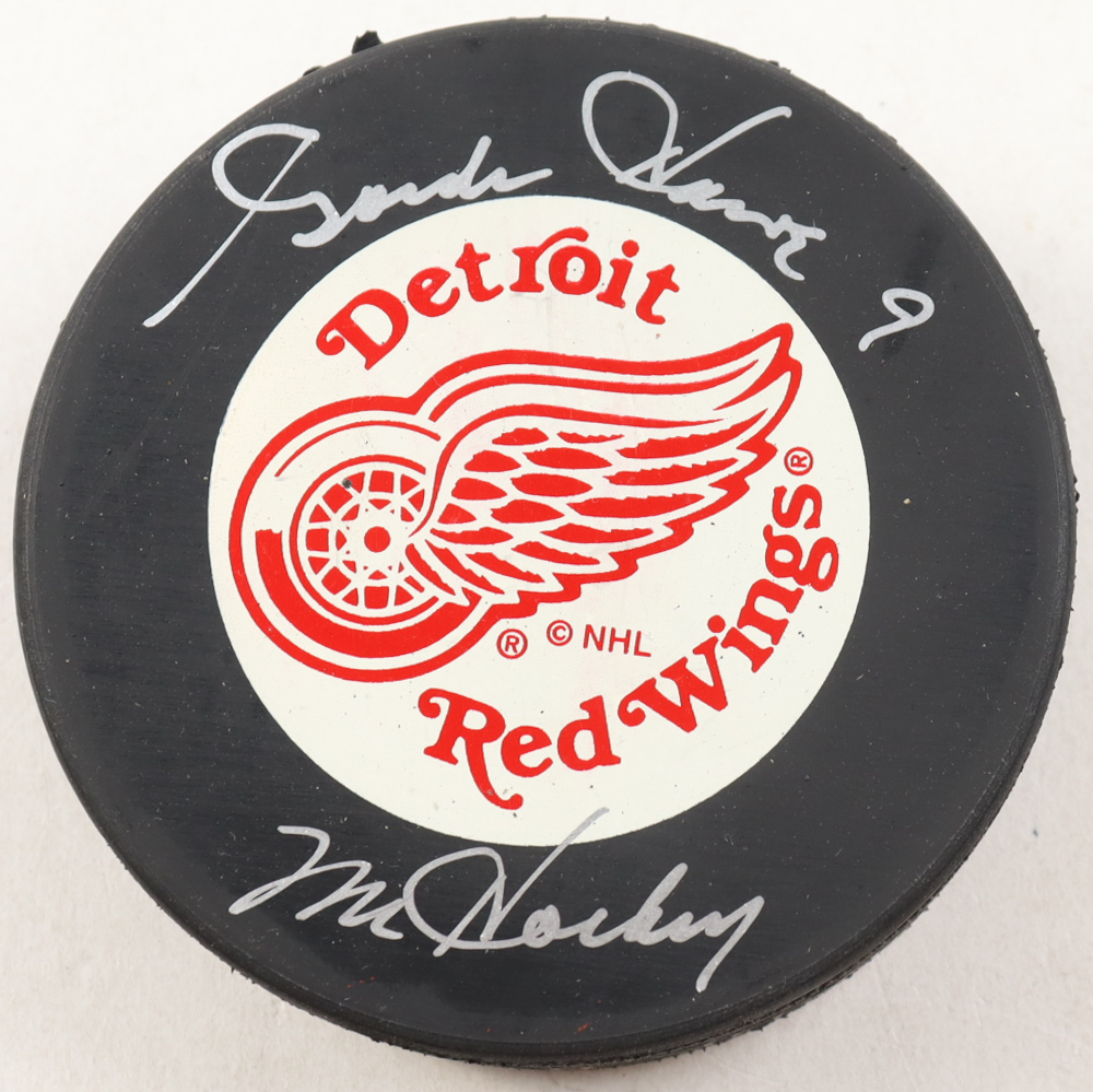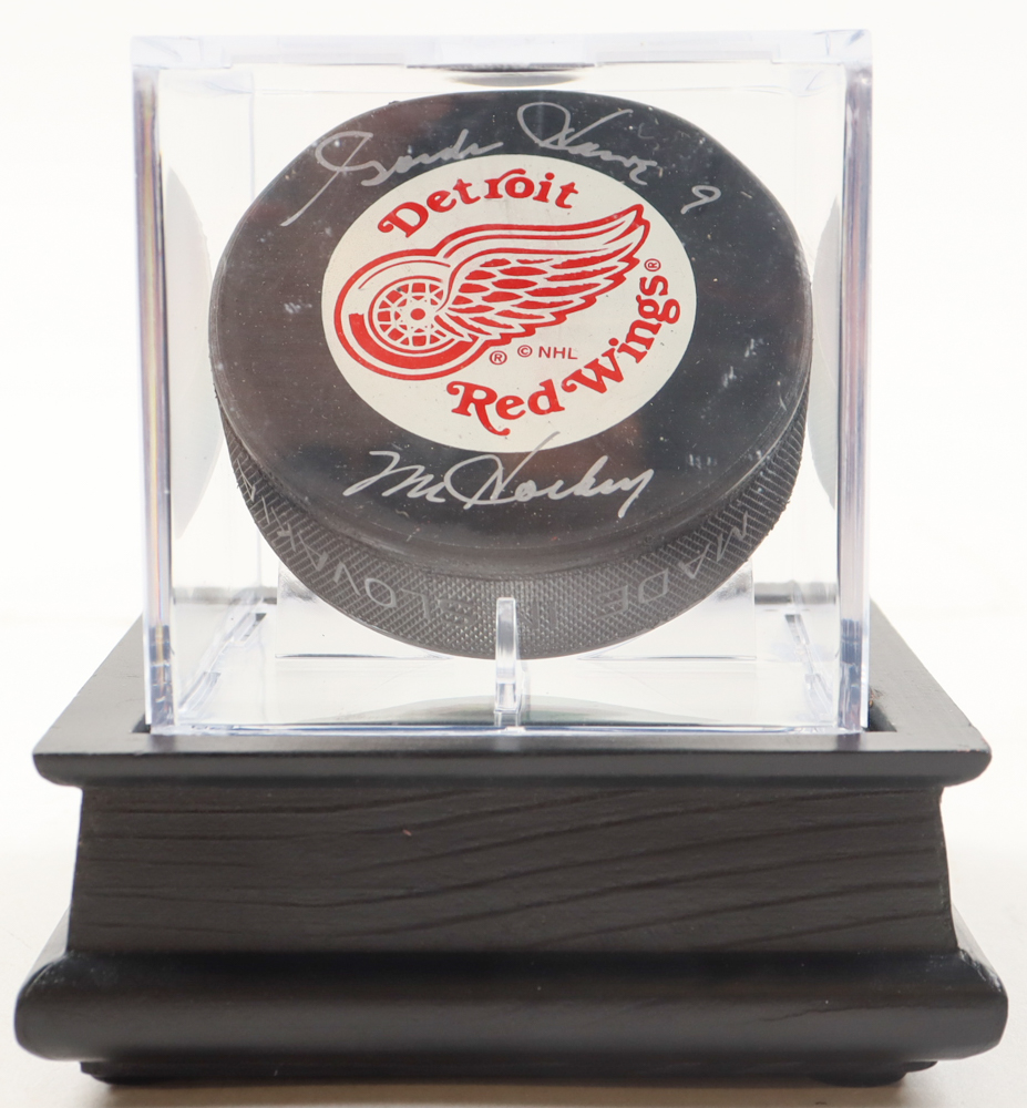 Official Detroit Red Wings Logo Hockey Puck. Hand-signed and inscribed by Gordie Howe (HOF). Display case is included as shown.