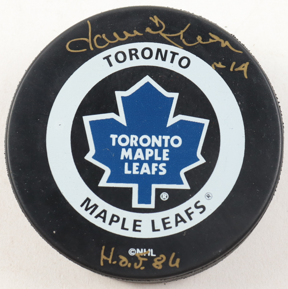 Official Toronto Maple Leafs Logo Hockey Puck. Hand-signed and inscribed by Dave Keon (Toronto Maple Leafs, HOF). Display case is included as shown.