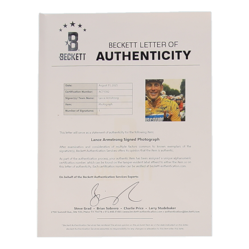 Photo measures 8" x 10" in size. Hand-signed by Lance Armstrong.