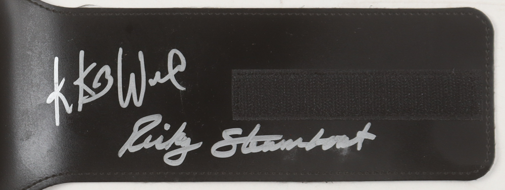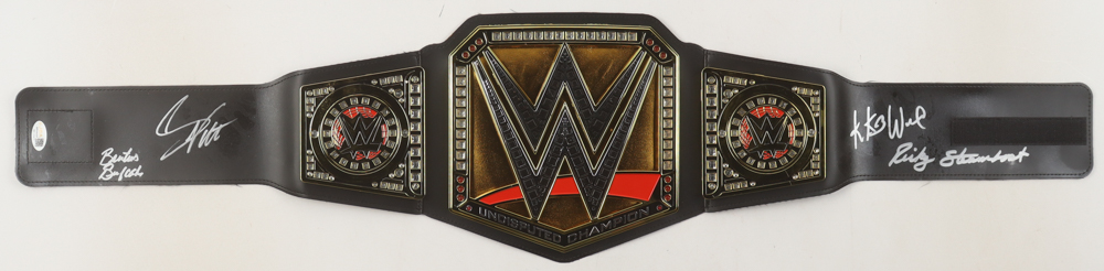 WWE plastic toy replica championship belt. Measures approximately 39" in length. Hand-signed and inscribed by Ricky Steamboat (HOF), Greg Valentine, Brutus Beefcake (HOF), and KoKo B. Ware (HOF).