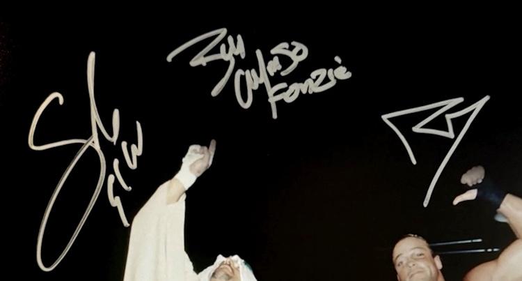 Photo measures 11" x 14" in size and has been hand signed by Sabu (D. 2025), Bill Alfonso, and Rob Van Dam .