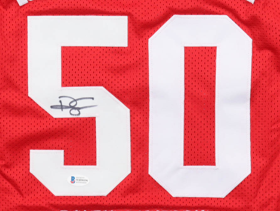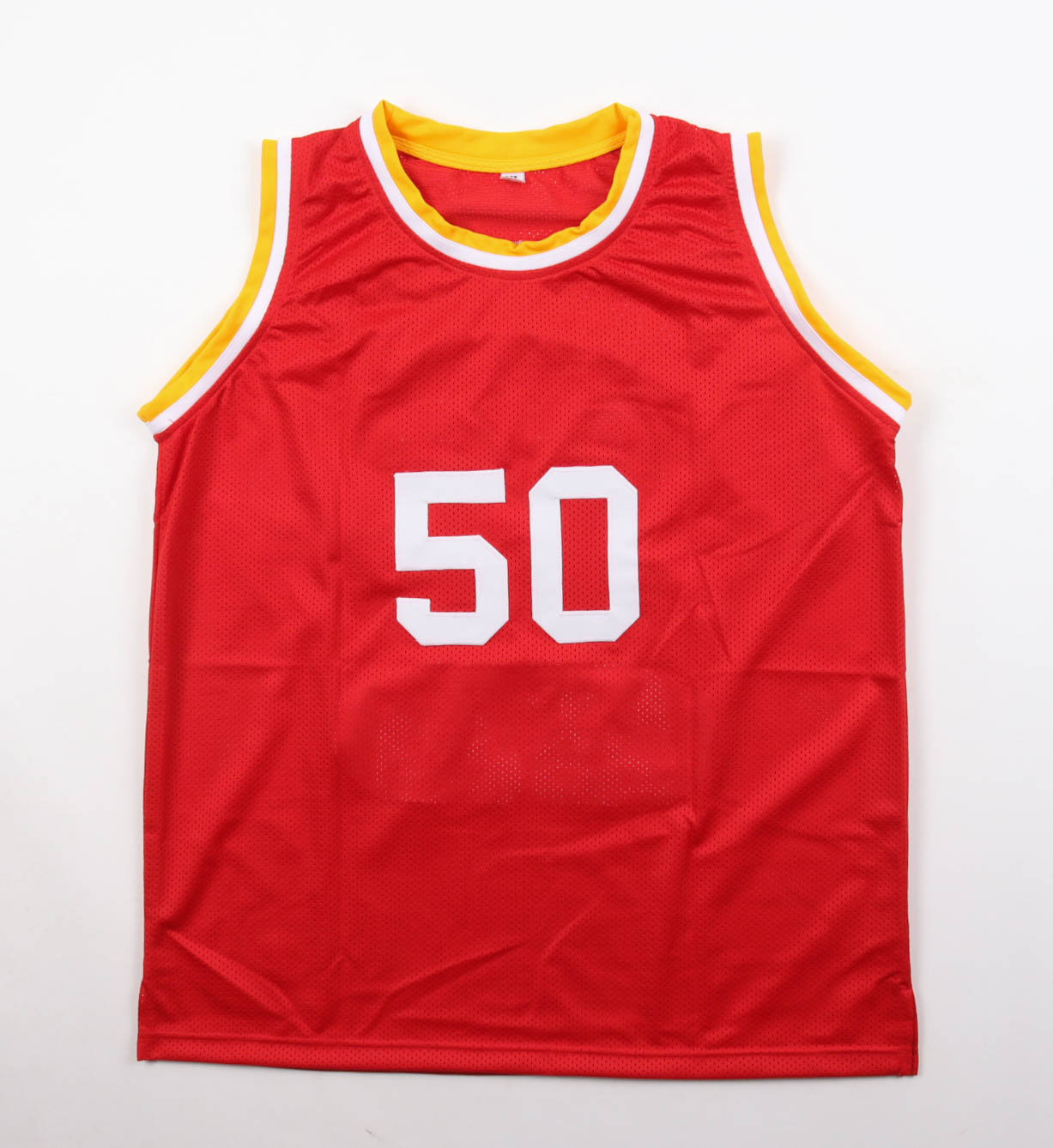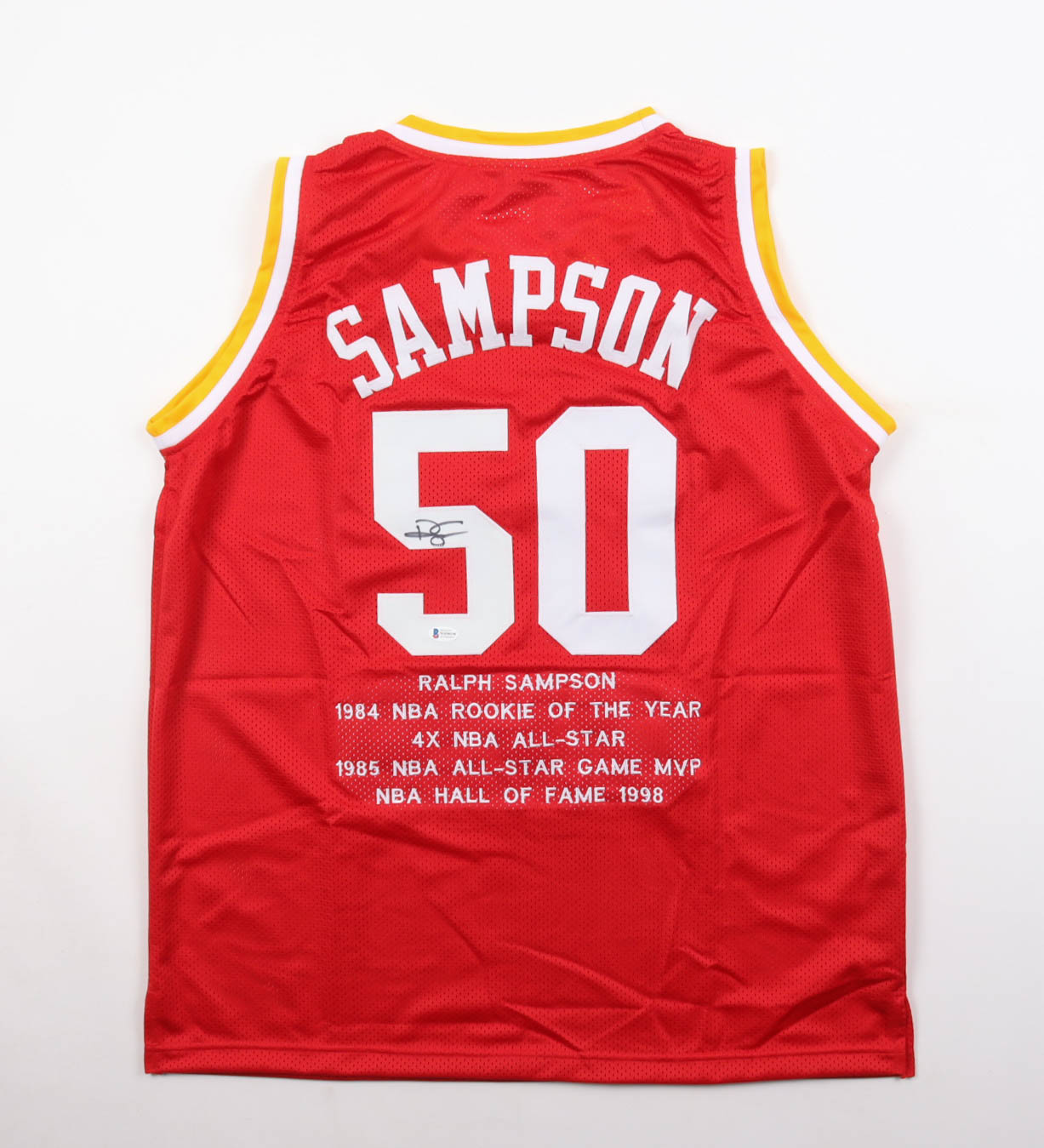 Custom jersey. Everything is sewn on, size XL. Hand-signed by Ralph Sampson. Sampson's career highlights are custom stitched below the numbers on the reverse side of the jersey.