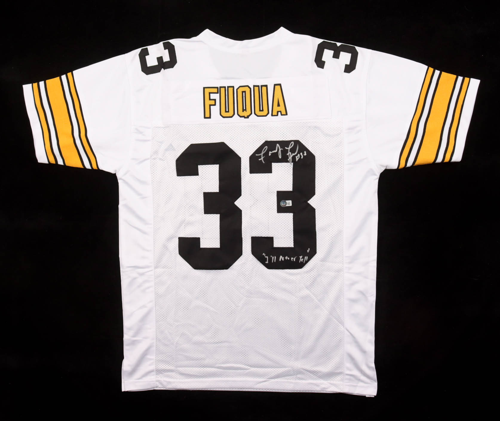 Custom jersey with everything sewn on, size XL. Hand-signed and inscribed by John "Frenchy" Fuqua.